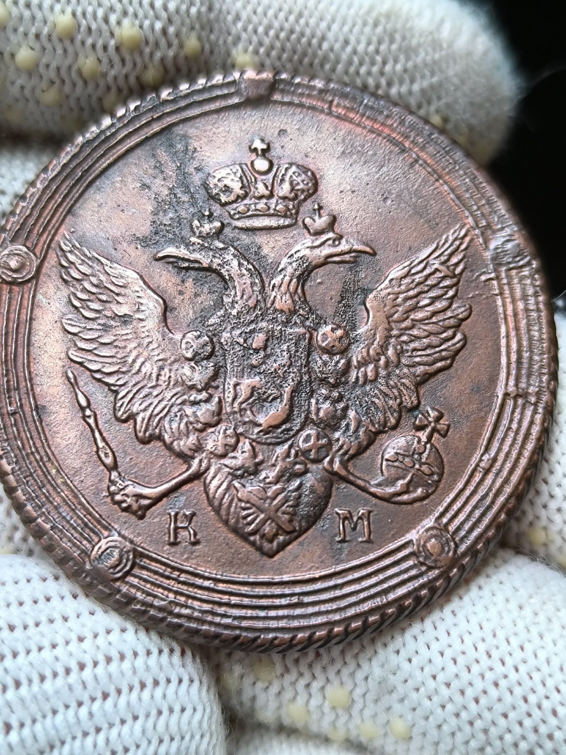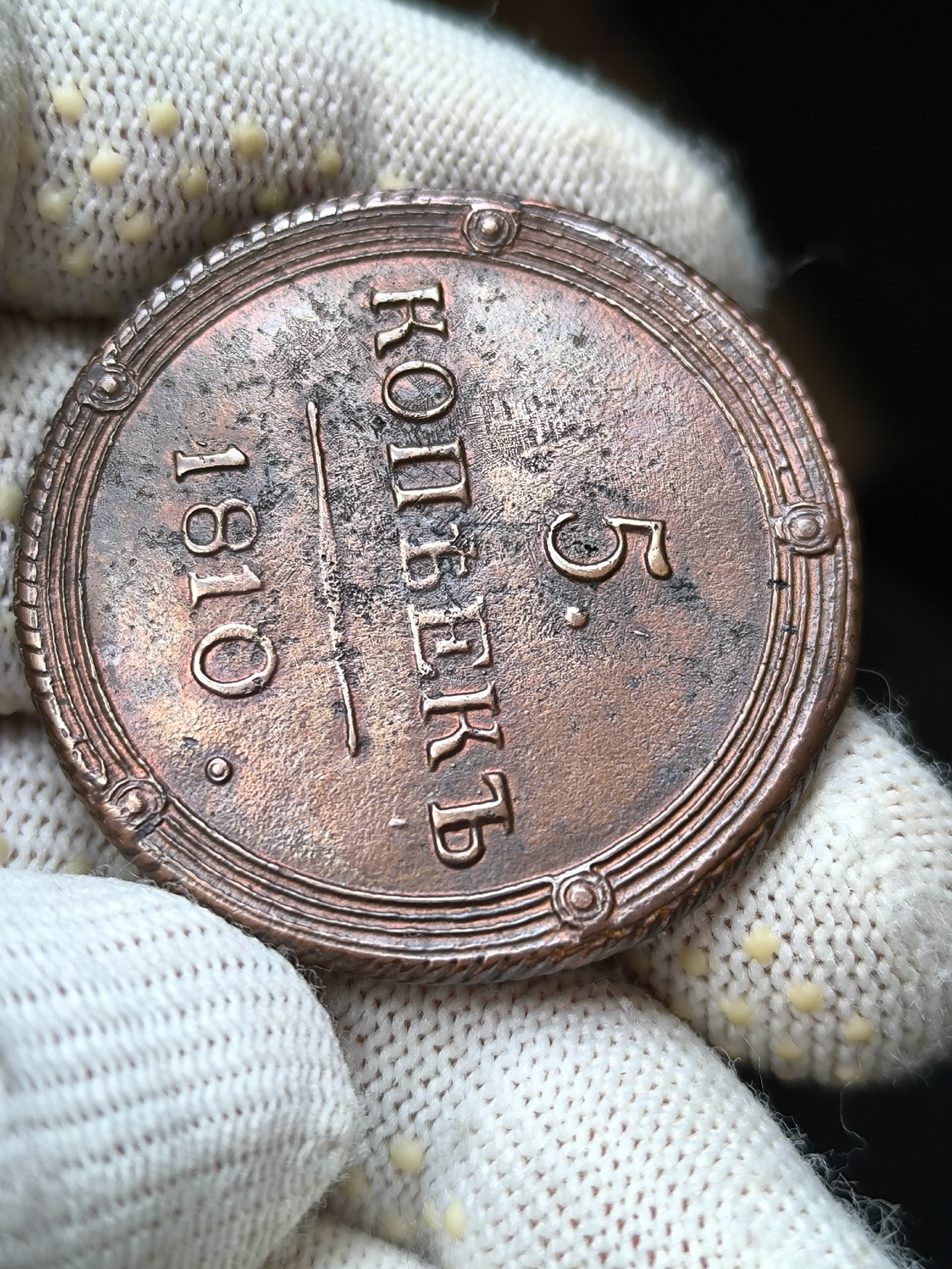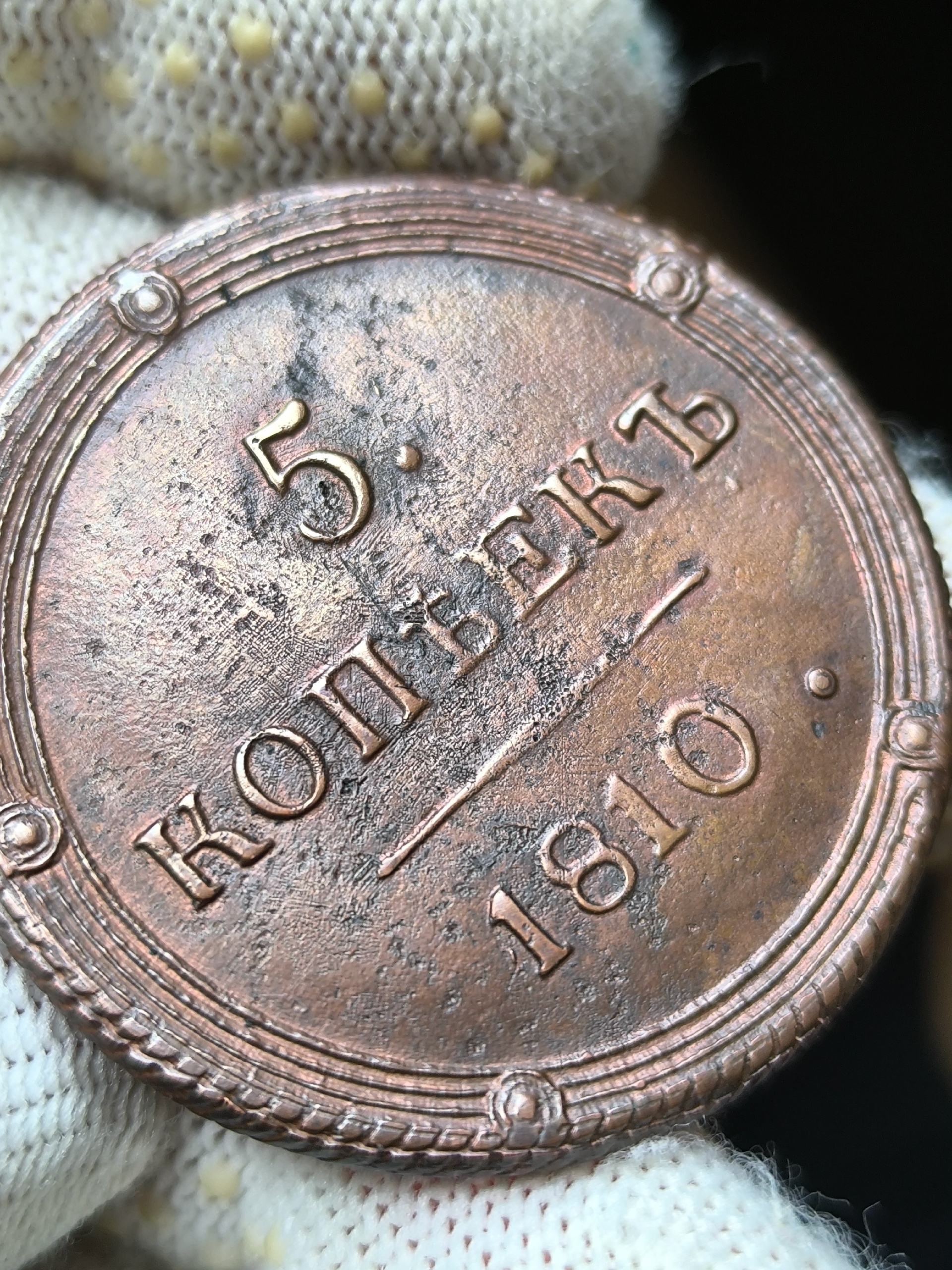 Медная монета 5 копеек 1810 года с инициалами минцмейстера КМ (Колпинский монетный двор) периода правления Александра I. Монета является современной подделкой, отлитой в форме. На подлинность указывают многочисленные дефекты: непролив металла, плохо нарезанный гурт, рыхлая поверхность поля и неверные детали в изображении короны и цифры даты.