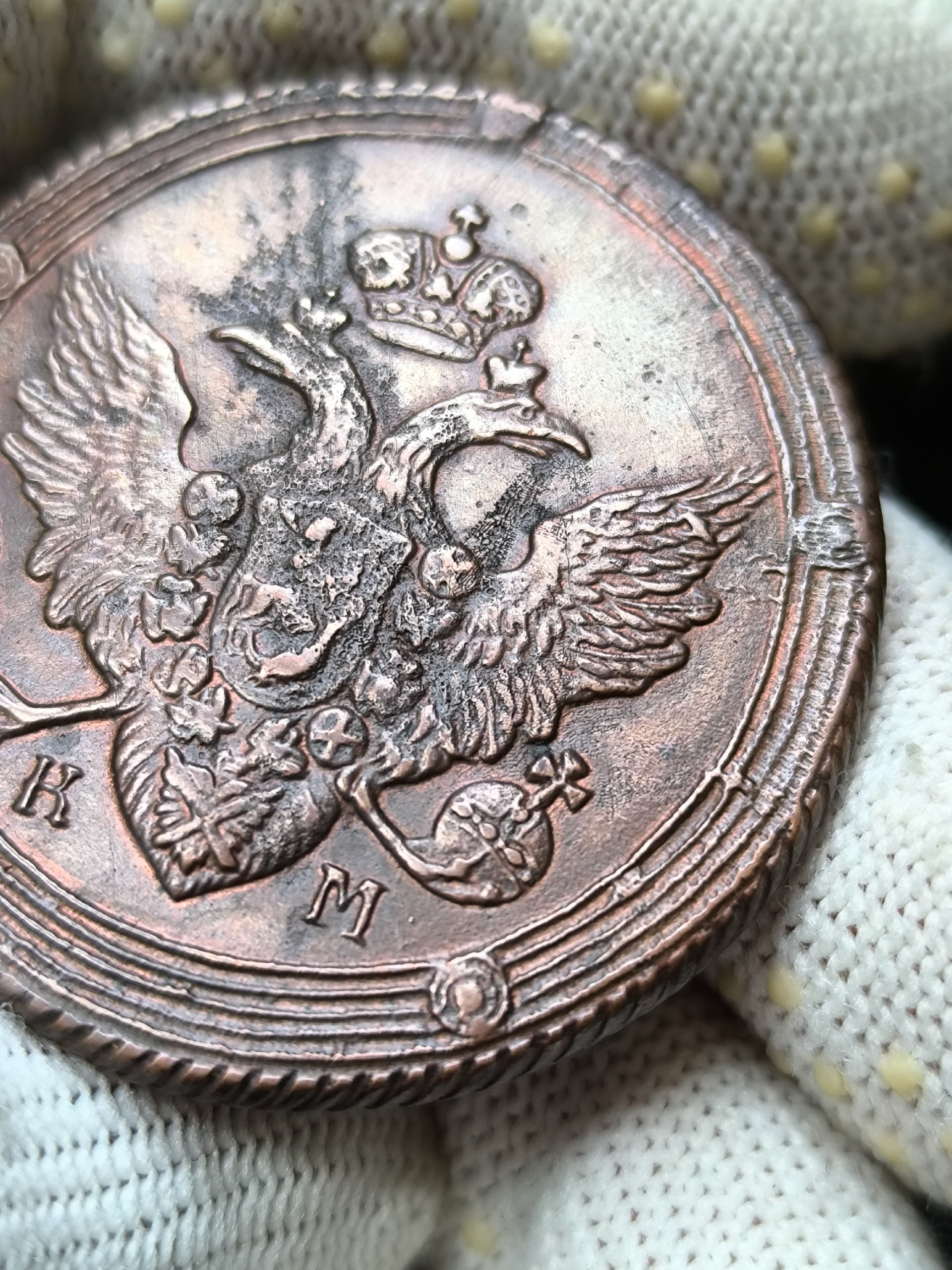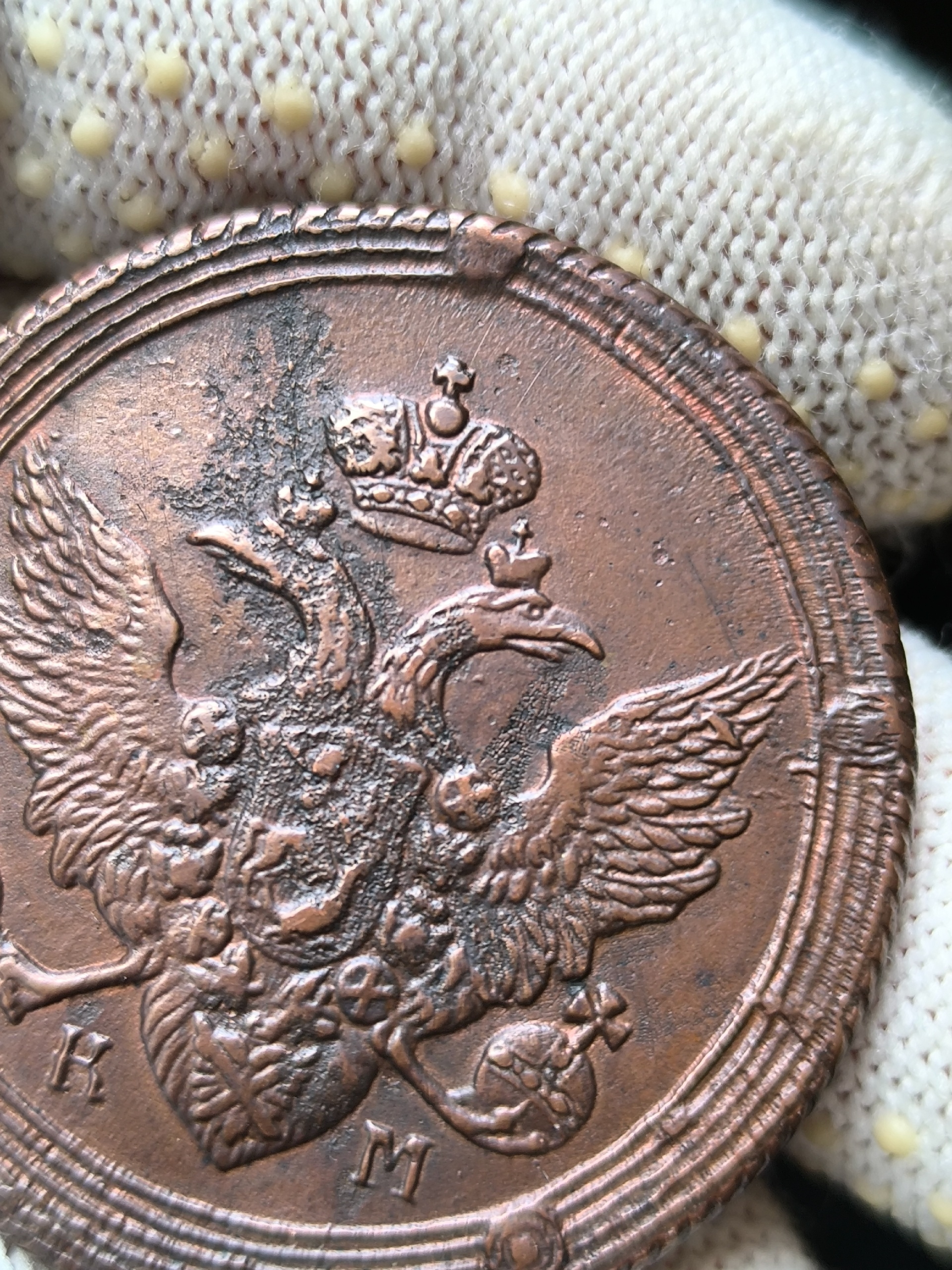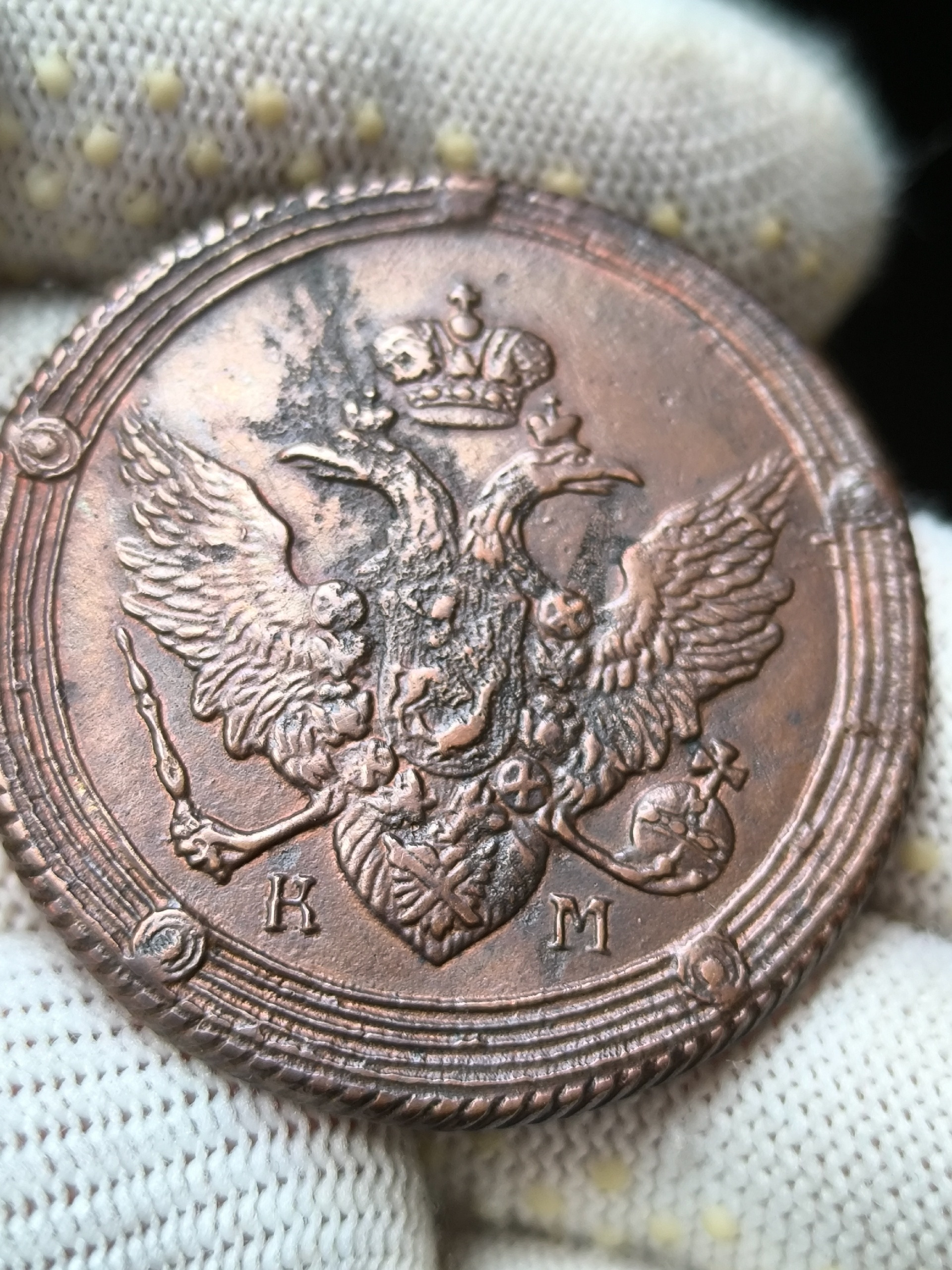 Медная монета 5 копеек 1810 года с инициалами минцмейстера КМ (Колпинский монетный двор) периода правления Александра I. Монета является современной подделкой, отлитой в форме. На подлинность указывают многочисленные дефекты: непролив металла, плохо нарезанный гурт, рыхлая поверхность поля и неверные детали в изображении короны и цифры даты.