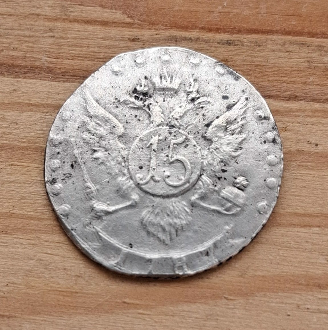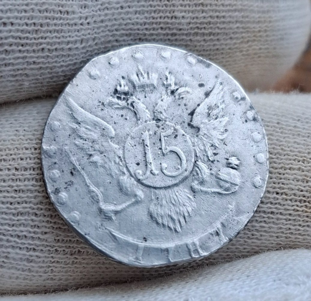 Монета 15 копеек 1787 года с монограммой Екатерины II и знаком Санкт-Петербургского монетного двора (СПБ). Серебряные монеты этого периода чеканились для обращения в Российской Империи. Однако, представленный экземпляр, судя по консенсусу экспертов, является современной подделкой, отлитой в форме.