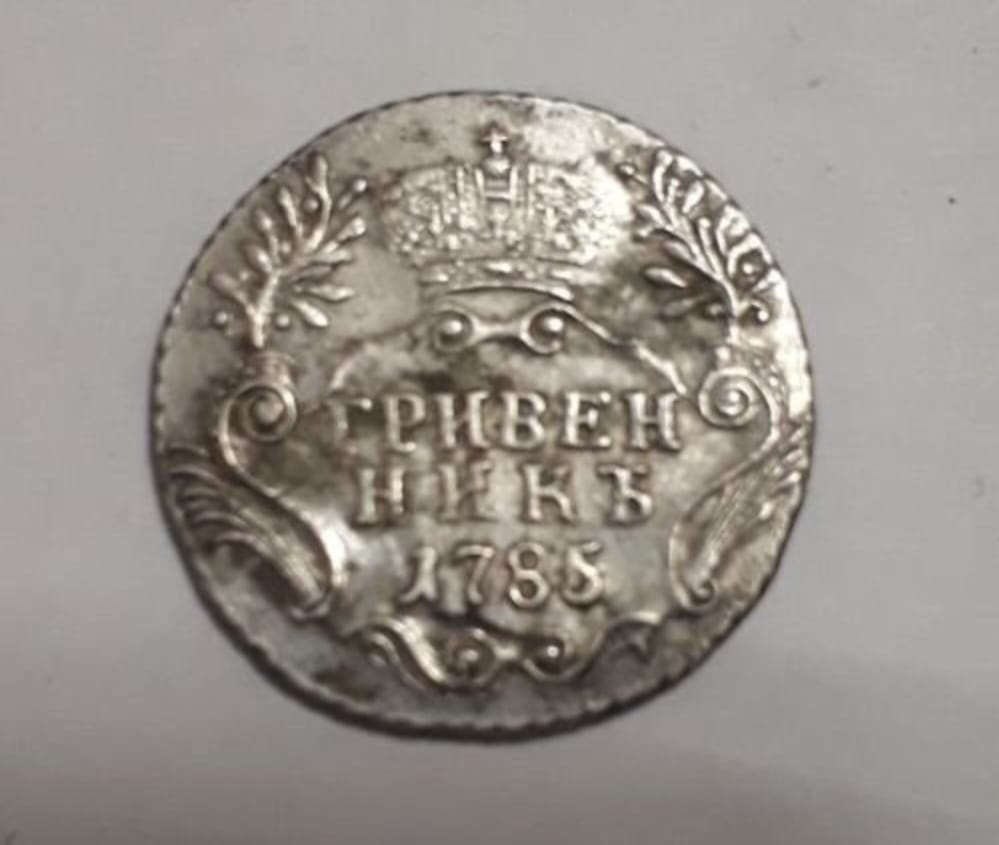 Монета представляет собой гривенник (10 копеек) 1785 года, отчеканенный при Екатерине II на Санкт-Петербургском монетном дворе (обозначение СПБ). Несмотря на внешнюю схожесть, большинство экспертов в комментариях склоняется к тому, что это литая копия, а не оригинальная чеканная монета. Подлинные экземпляры этого периода имеют чёткие детали и характерные признаки чеканки, которые на представленных фото отсутствуют.