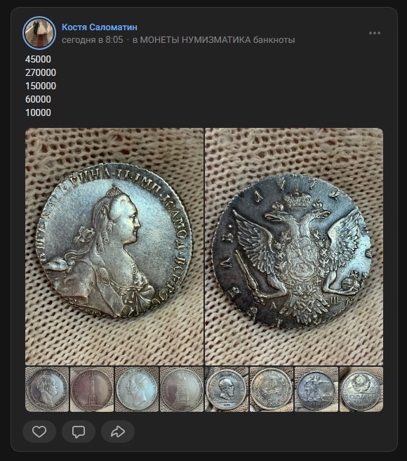 Монета представляет собой серебряный рубль периода правления Екатерины II, отчеканенный на Санкт-Петербургском монетном дворе. Однако, согласно консенсусу экспертов в комментариях, это современная литая подделка низкого качества («фуфло»). Подобные копии, часто изготавливаемые в Китае, массово встречаются на рынке.