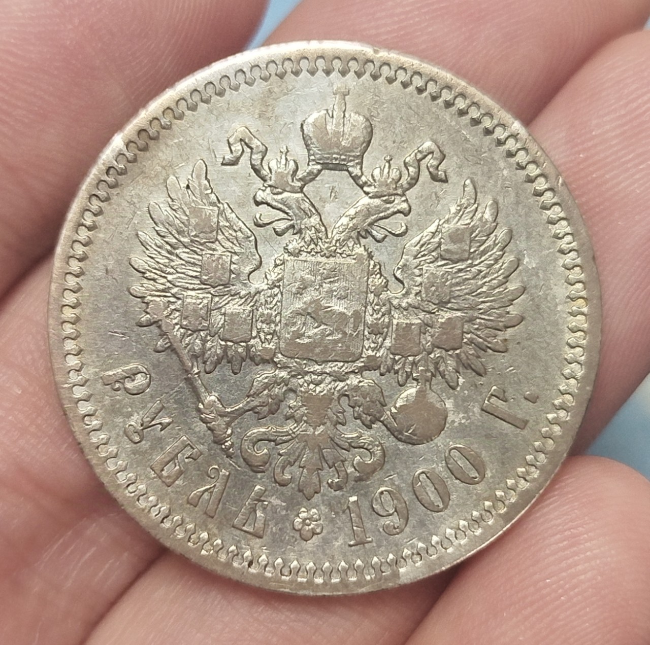 Представленная монета — серебряный рубль 1900 года с портретом императора Николая II. Несмотря на внешнюю сохранность, она является фальшивкой, так как в указанном году портрет 3 типа (с бородой) не чеканился. Данный тип портрета начали использовать только с 1912 года, что делает монету исторически несоответствующей и поддельной.