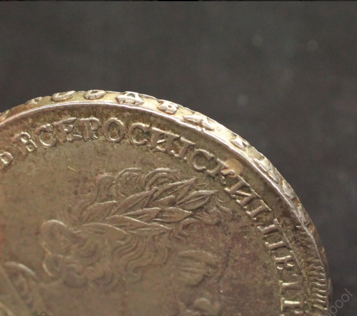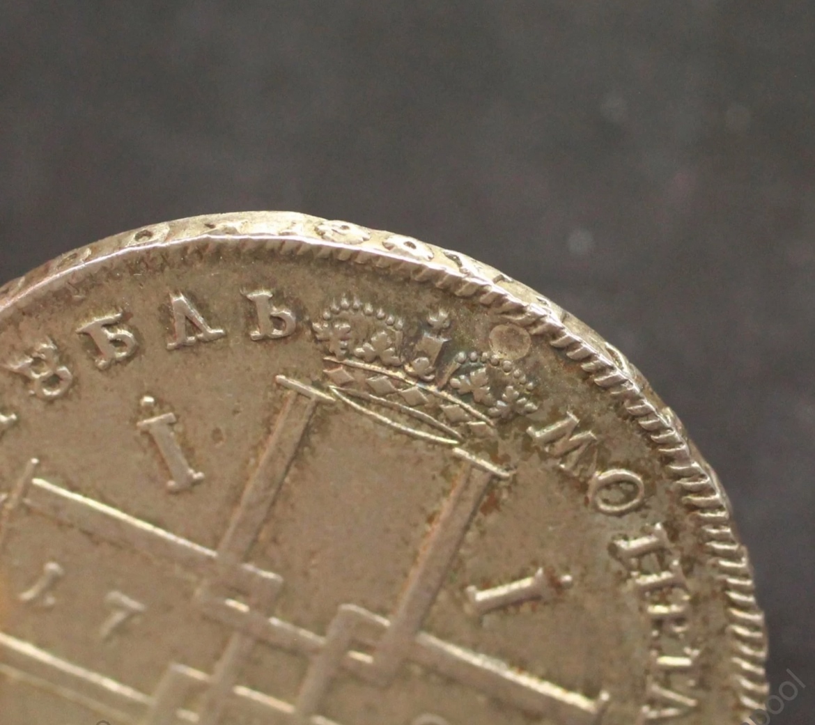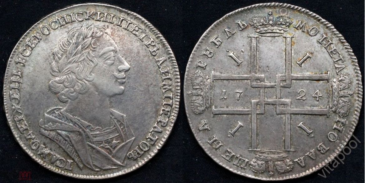 Представленная монета — рубль 1724 года периода правления Петра I. Несмотря на заявленную подлинность, это фейковая копия. Основными признаками подделки являются отсутствие важных деталей (букв), несоответствующий гурт и следы грубой реставрации — заделанное отверстие, что нехарактерно для оригинальных экземпляров.