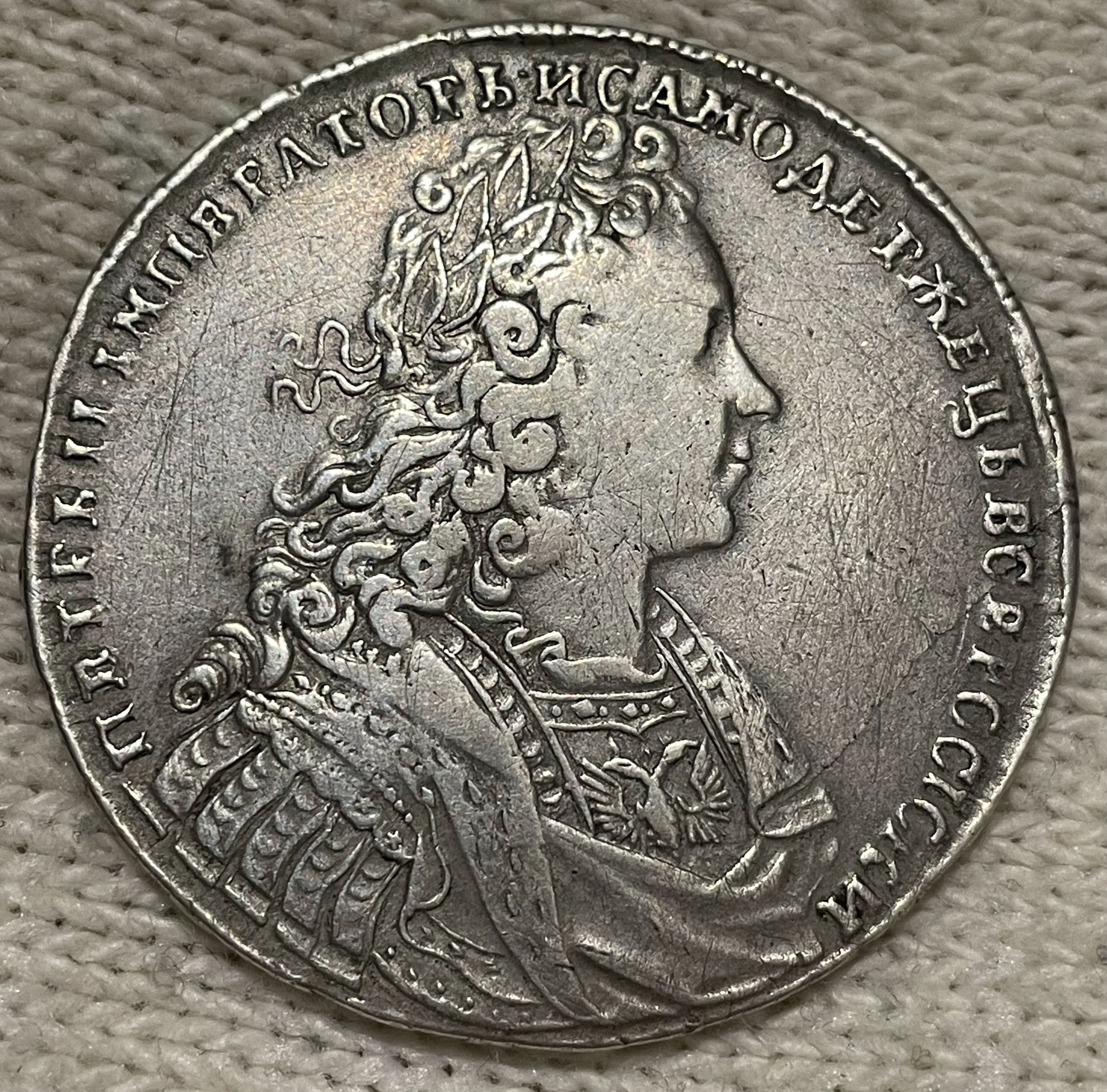 Серебряный рубль 1728 года, отчеканенный в правление императора Петра II. Монета периода «дворцовых переворотов» с портретом молодого императора. На основании анализа фото и консенсуса в комментариях монета признана подлинной, несмотря на отдельные замечания по патине.