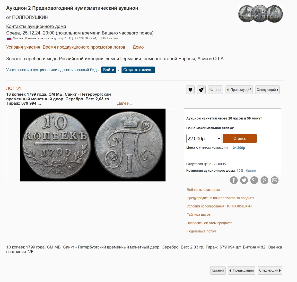 Монета 10 копеек 1799 года, отчеканенная при императоре Павле I из серебра, является подделкой. Она была снята с торгов после того, как эксперты и участники сообщества выявили её как фейк. Продавец, известный нумизмат, пытался объяснить сомнительное состояние монет агрессивной чисткой, но это не убедило коллекционеров.