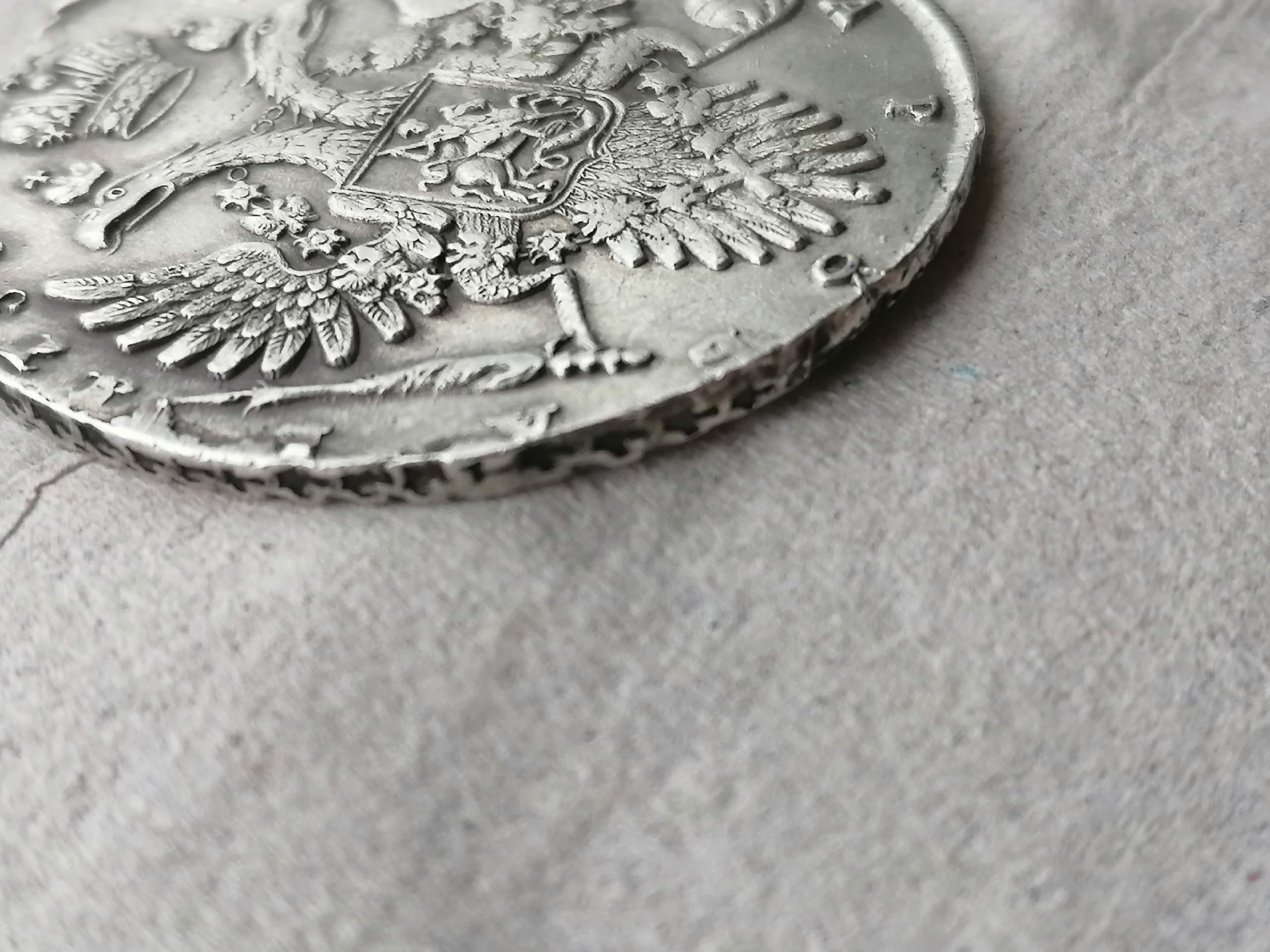Представленная монета — рубль 1733 года, отчеканенный в правление императрицы Анны Иоанновны. Несмотря на внешнюю привлекательность и попытку имитации старения, это современная копия. Монета не соответствует оригиналу по ряду ключевых признаков, включая нехарактерную деформацию краёв и искусственную патину.
