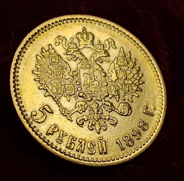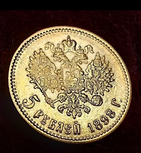 Золотая монета Российской Империи номиналом 5 рублей 1898 года, отчеканенная в период правления императора Николая II. Монета имеет стандартные параметры для данного типа: вес 4.3 г, проба золота 900. На основе консенсуса в комментариях экспертов признана подлинным оригинальным экземпляром.