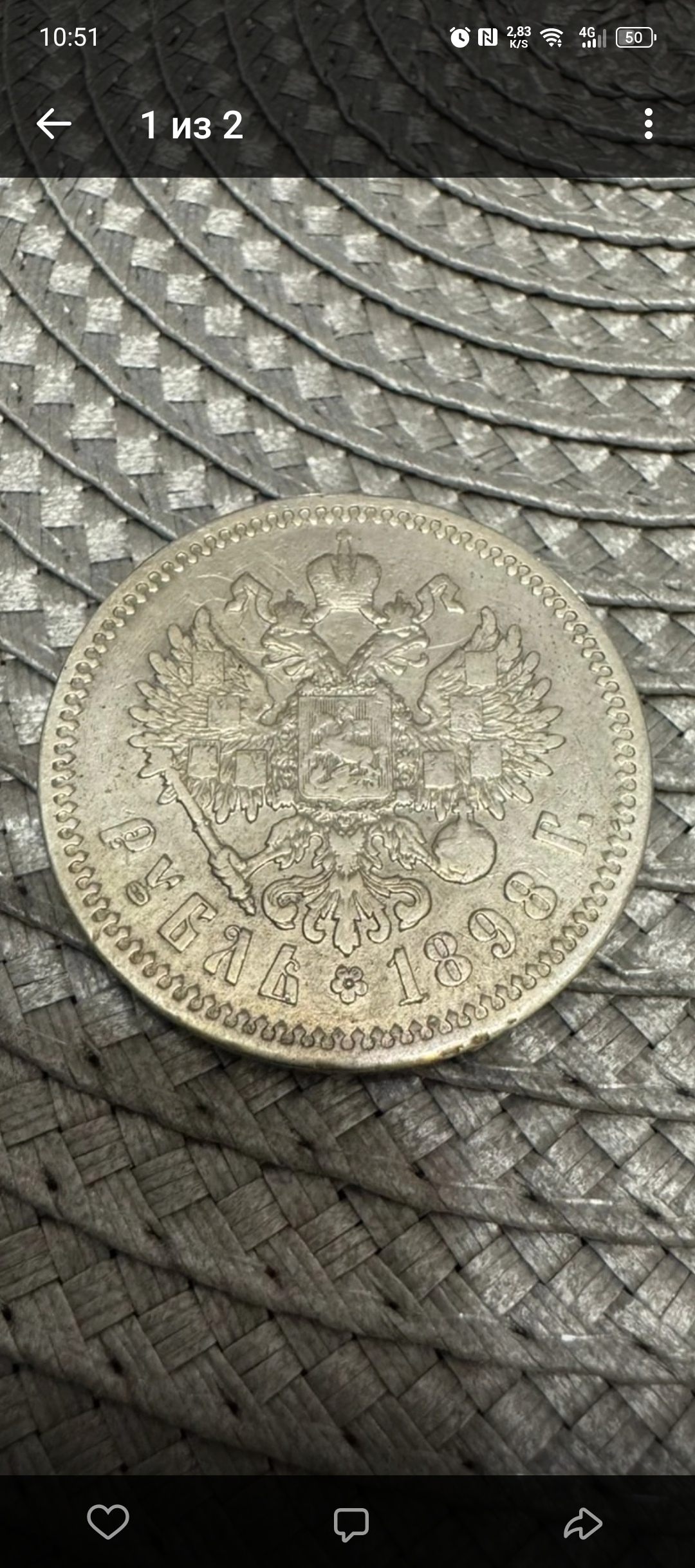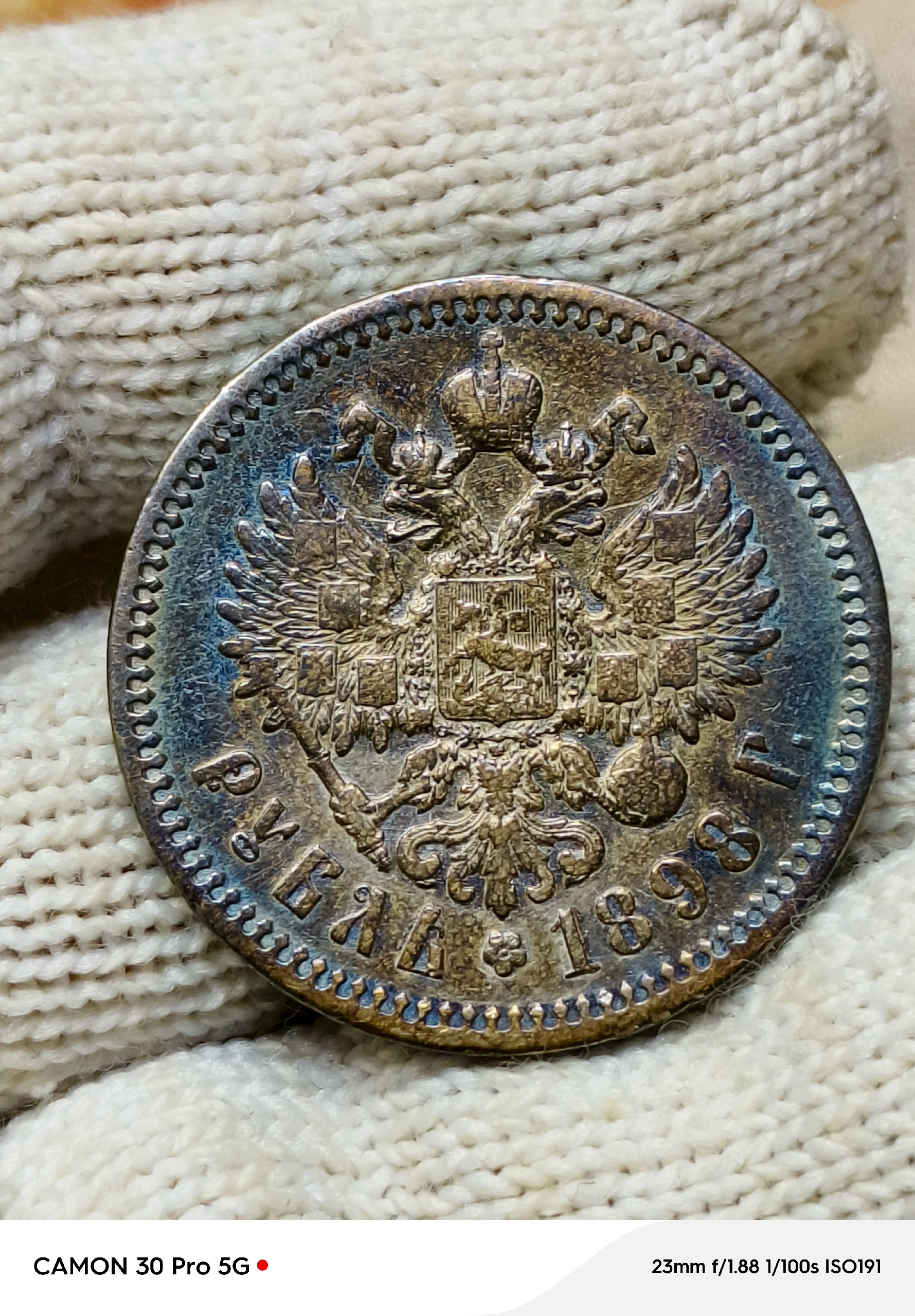 Серебряный рубль 1898 года, отчеканенный в период правления императора Николая II. Монета имеет стандартные параметры для данного типа: вес 20 г, диаметр 33.65 мм, 900-я проба серебра. Подавляющее большинство комментаторов в сообществе признали её оригиналом, отметив лишь неидеальную патину.
