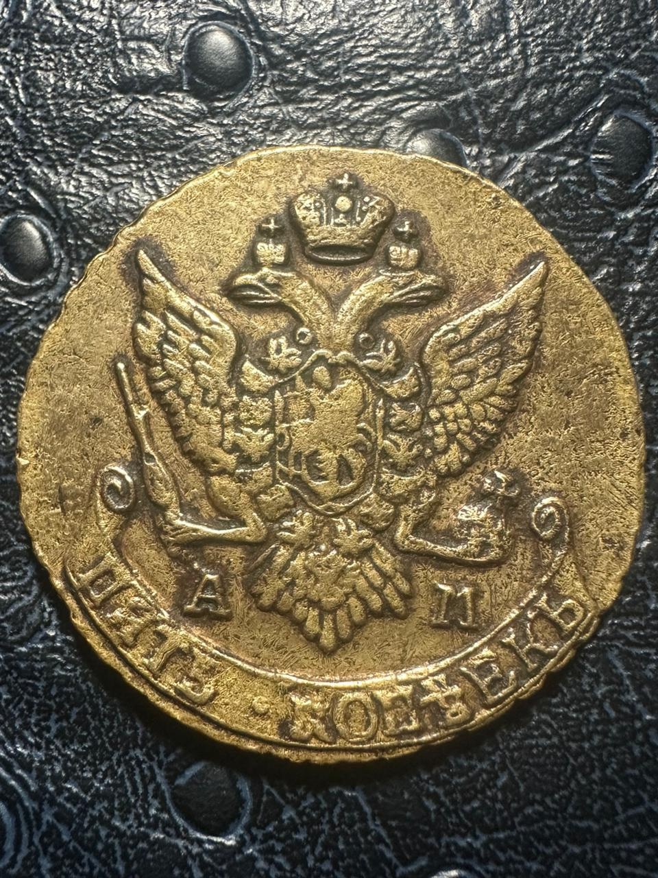 Монета номиналом 5 копеек 1796 года с вензелем Екатерины II (ЕМ). Несмотря на заявленный номинал и период, монета признана подделкой. Эксперты отмечают несоответствие деталей (бант, венок, шрифты) оригинальным штемпелям, а также следы агрессивной механической чистки, скрывающей признаки литья.
