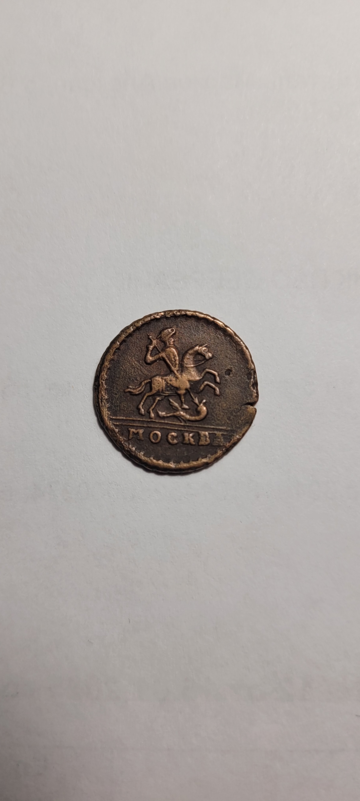 Медная копейка 1728 года, отчеканенная в правление Петра II. Монета вызывает серьёзные сомнения в подлинности из-за нестандартных деталей изображения всадника (конь без гривы, три точки на попоне, нерастрёпанный хвост) и аномалий гурта. Большинство экспертов в обсуждении склоняется к версии о фейке.