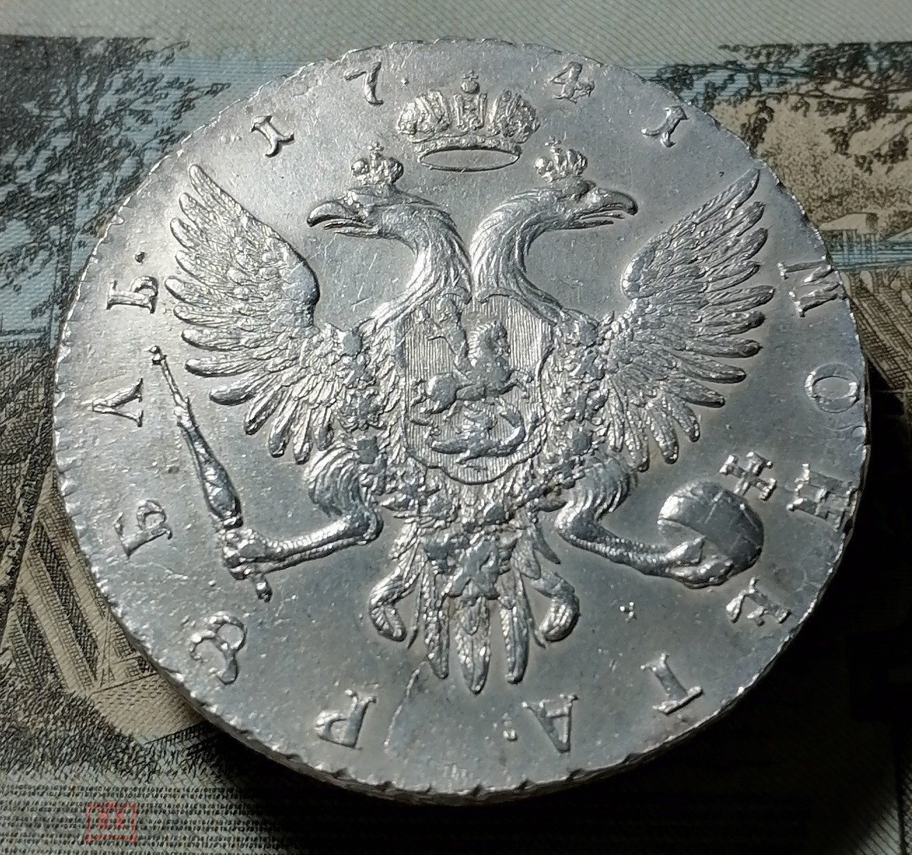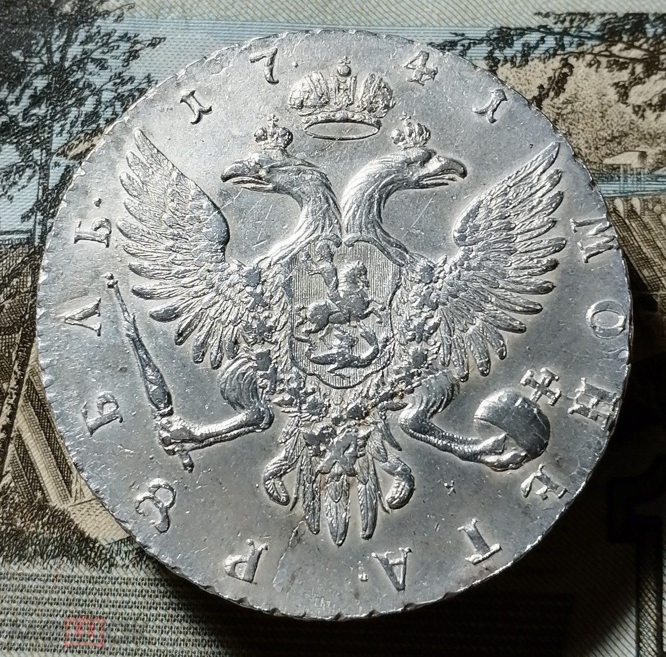 Монета представляет собой копию серебряного рубля 1741 года, отчеканенного при императрице Елизавете Петровне на Санкт-Петербургском монетном дворе (обозначение СПБ). В оригинале это редкая и ценная монета, однако представленный экземпляр является современной репликой, не имеющей нумизматической ценности.