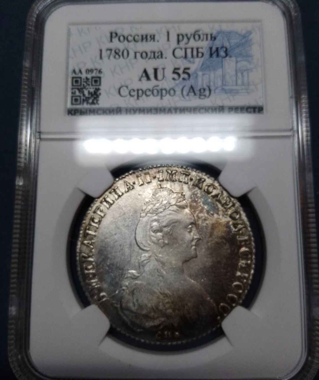 Монета представляет собой подделку (фейк) рубля 1780 года периода правления Екатерины II, отчеканенного на Санкт-Петербургском монетном дворе (СПБ). Это современная реплика, выполненная доработанными штемпелями, с характерными для клонов артефактами: остаточными следами на щеке императрицы и типичными царапинами на колонне. Монета активно продаётся на китайских площадках и не является оригинальным серебряным изделием.