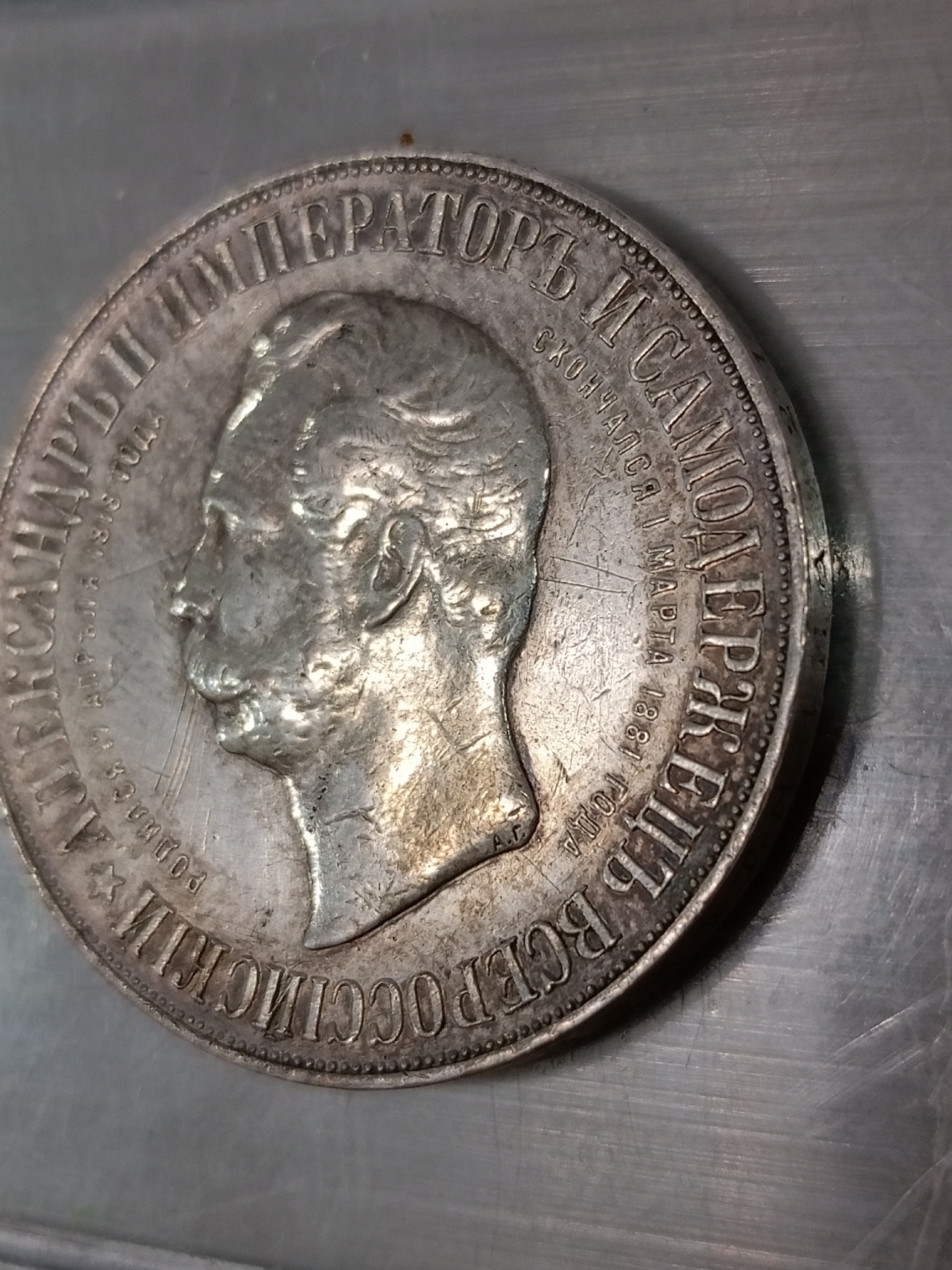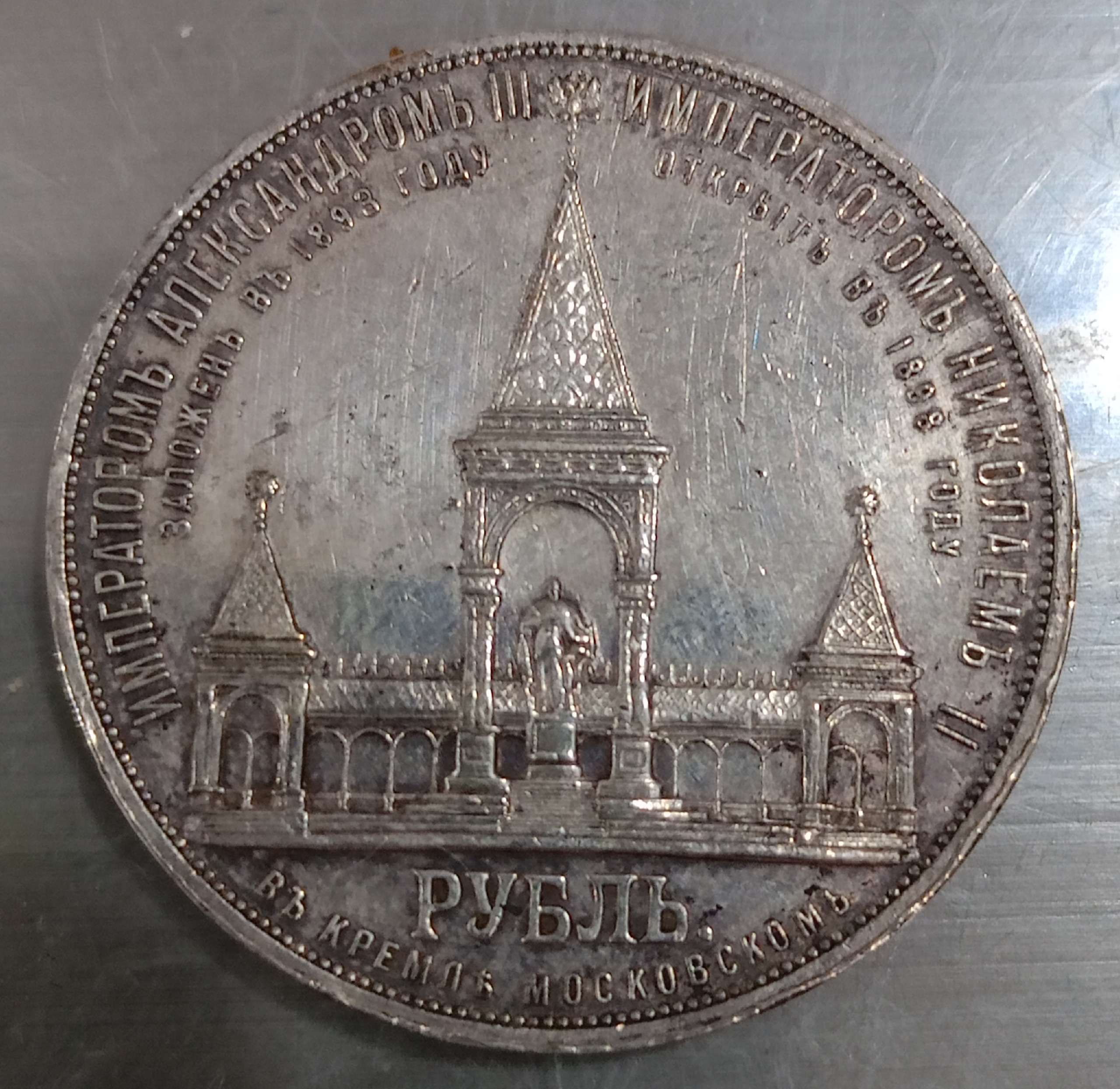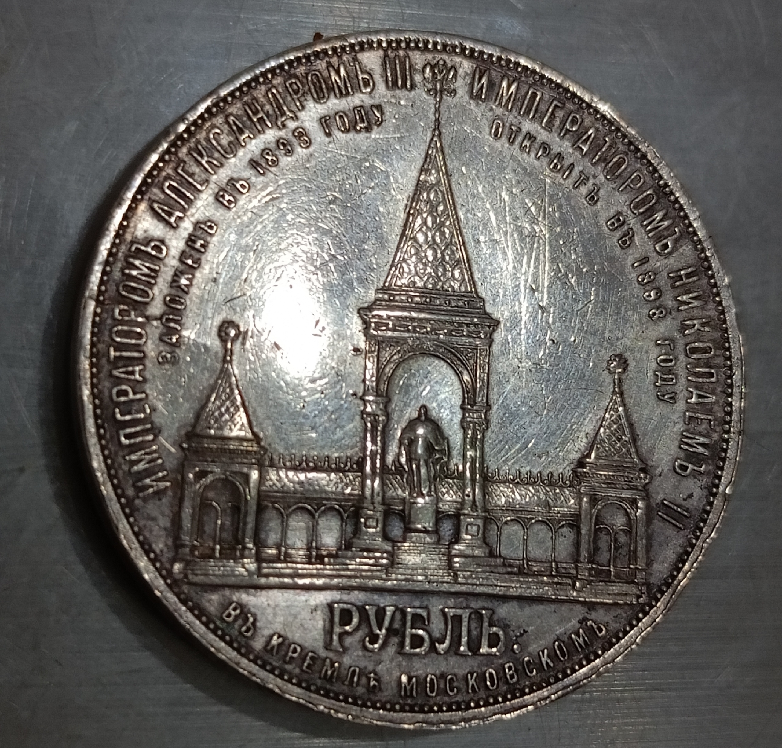 Серебряный рубль 1898 года, известный среди коллекционеров как «Дворик» из-за изображения памятника Александру II на реверсе. Монета отчеканена в период правления императора Николая II. Большинство экспертов в комментариях признают её подлинной, отмечая чёткую детализацию и отсутствие явных признаков подделки.