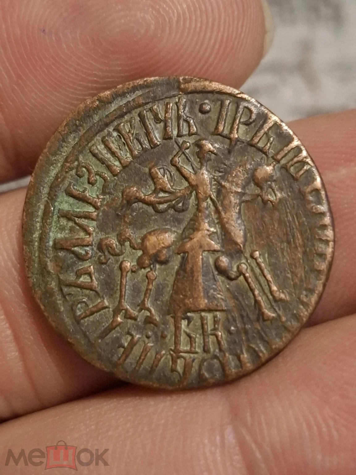 Представленная монета — медная копейка 1710 года, отчеканенная в период правления Петра I. Несмотря на привлекательный внешний вид, большинство экспертов в комментариях признали её фейком. Основной причиной сомнений являются неестественные, нехарактерные для подлинных монет того времени, очертания букв на легенде.