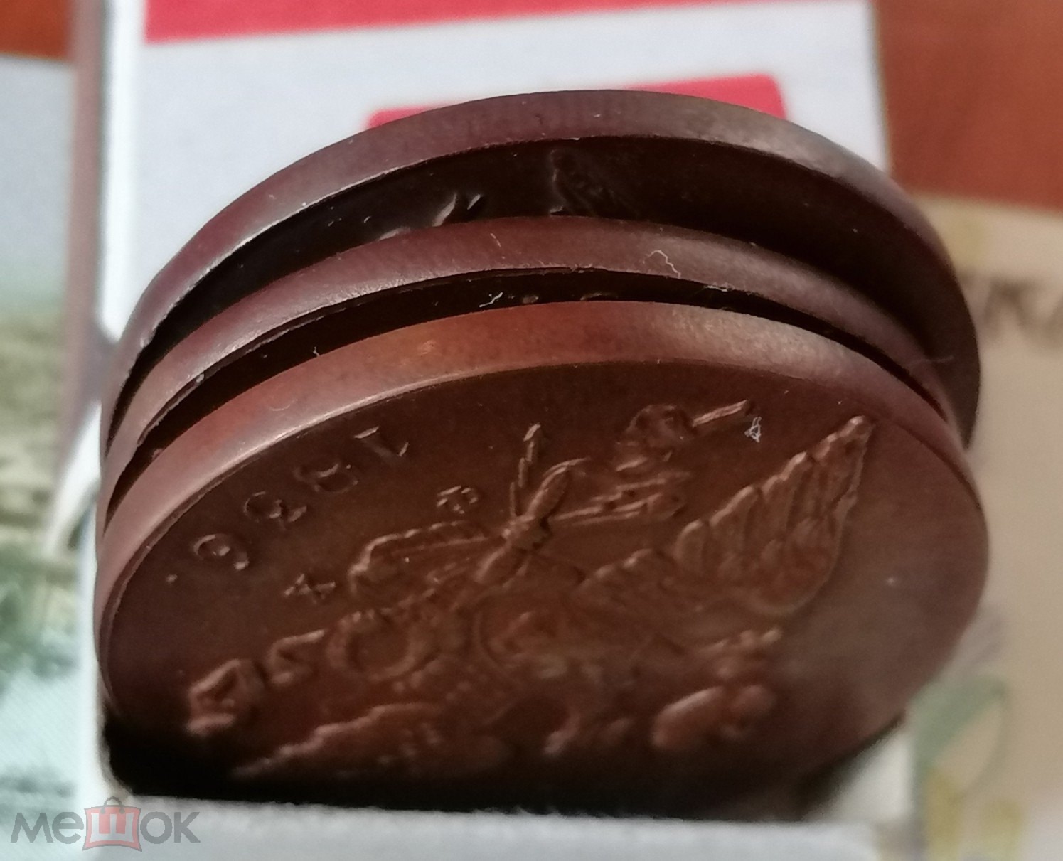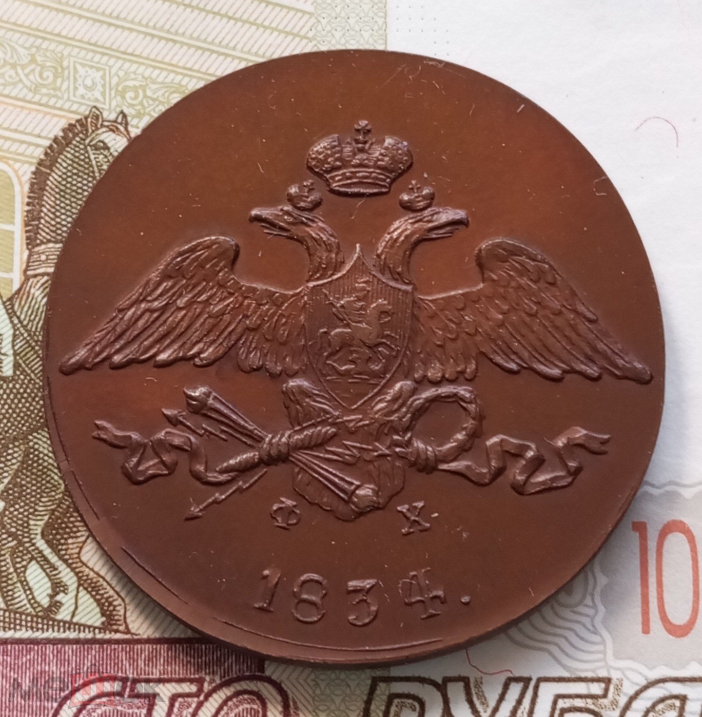 Монета 5 копеек 1834 года с инициалами минцмейстера ЕМ (Егор Молчанов), отчеканенная в период правления Николая I. В оригинале это медная монета крупного формата. Представленный экземпляр является копией, о чём прямо указано в описании поста, что подтверждается консенсусом в комментариях.