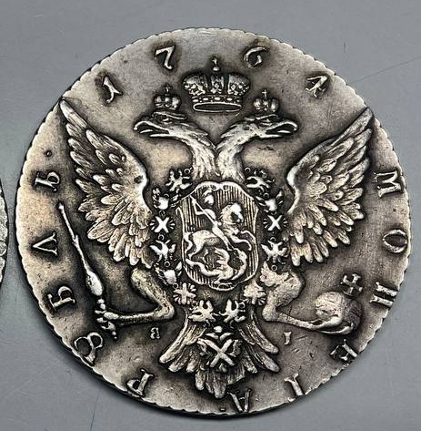 Монета представляет собой фальшивую копию серебряного рубля 1764 года периода правления императрицы Екатерины II. Оригинальные рубли этого года чеканились на Санкт-Петербургском монетном дворе и имеют высокий коллекционный интерес. Представленный экземпляр признан подделкой (фуфлом) из-за несоответствия деталей штемпеля, нехарактерного металла или литья, что видно специалистам даже по фото.