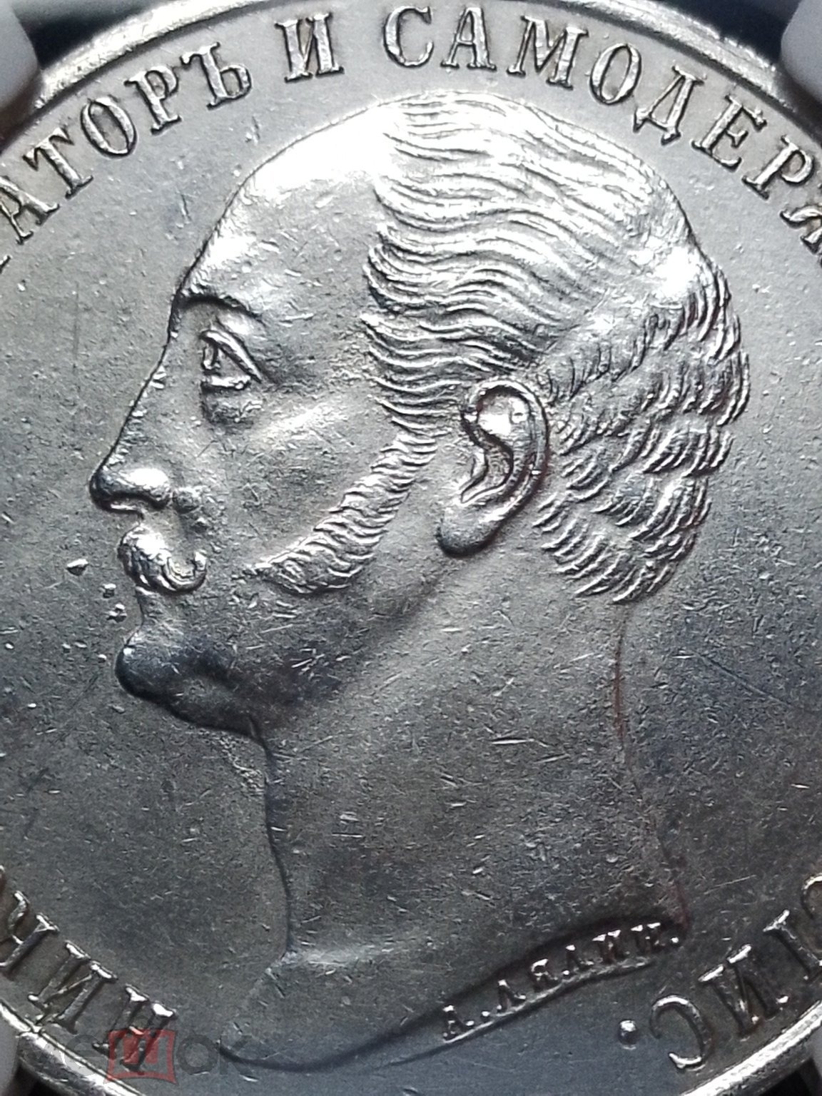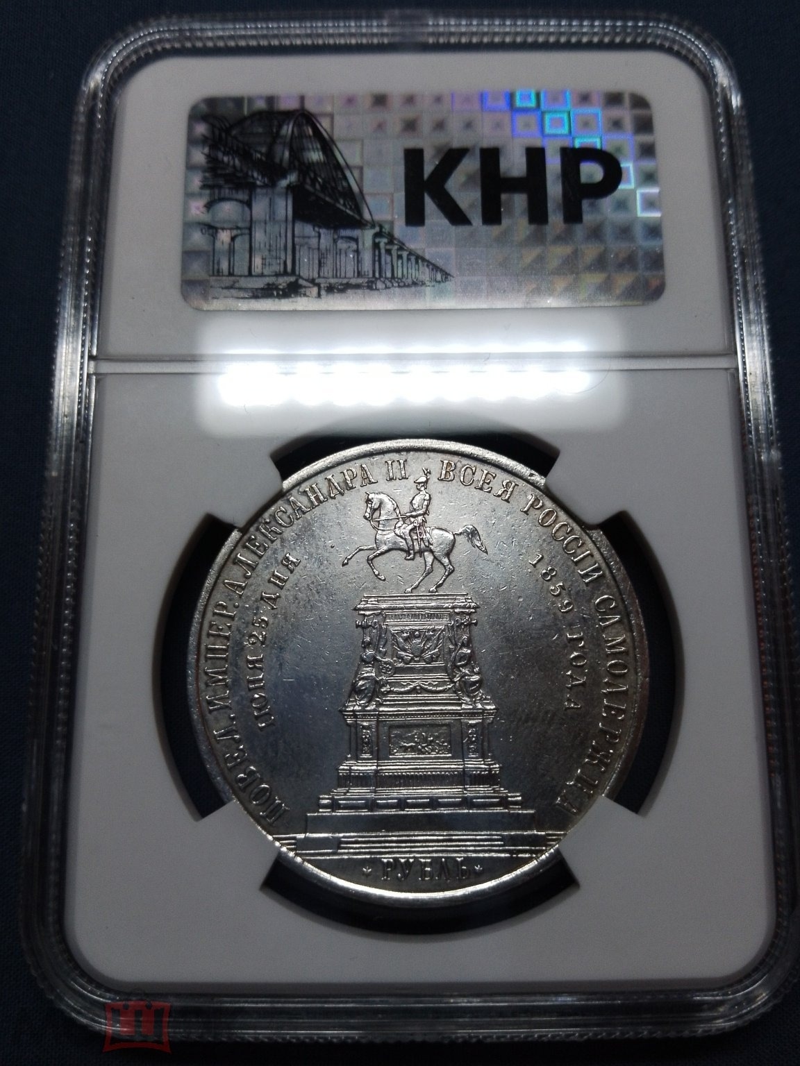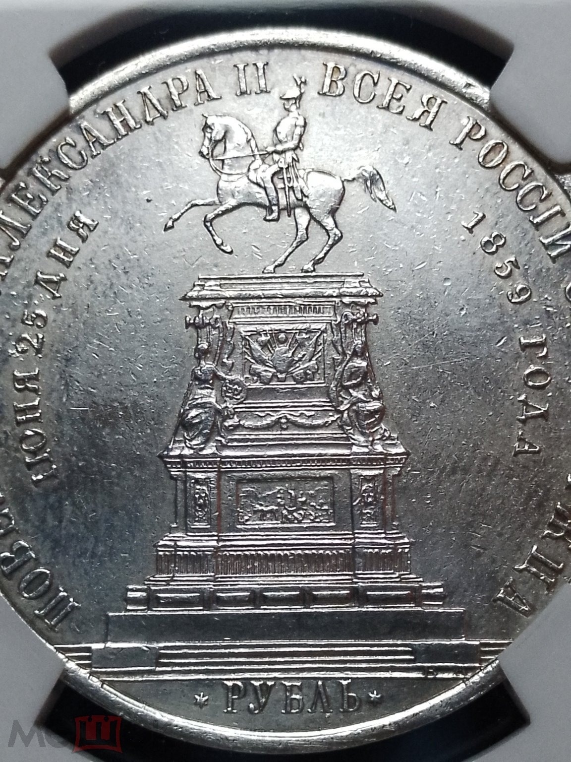Представленная монета — серебряный рубль 1859 года, отчеканенный в правление императора Александра II. Монета является современной подделкой, изготовленной методом литья, что видно по нечётким деталям и структуре поверхности. Она была неоднократно замечена на аукционах в разных пластиковых холдерах (слабах) сомнительных сертификационных компаний.