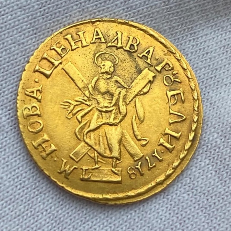 Монета номиналом 2 рубля 1718 года, отчеканенная в правление Петра I из серебра. В оригинале это редкая и ценная монета. В данном случае представлена откровенная подделка, о чём прямо указано в описании поста.
