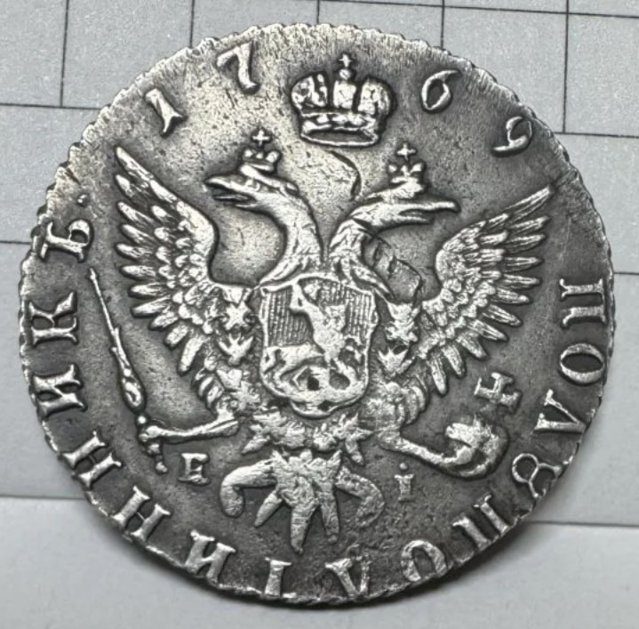 Полуполтинник 1769 года с монетным двором ММД (Московская монета) — серебряная монета Российской Империи времён Екатерины II. В оригинале это редкая и ценная монета, однако в данном случае автор поста прямо указывает, что это подделка. Копии таких монет часто изготавливаются для коллекционеров, не готовых платить за дорогой оригинал.