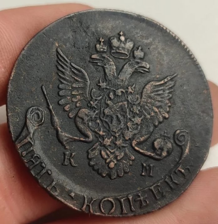 Монета представляет собой копию медных 5 копеек 1786 года, отчеканенных в правление Екатерины II. Несмотря на внешнюю привлекательность, это современная литая подделка, изготовленная с оригинального образца. Такие экземпляры не имеют коллекционной ценности и считаются сувенирной продукцией.