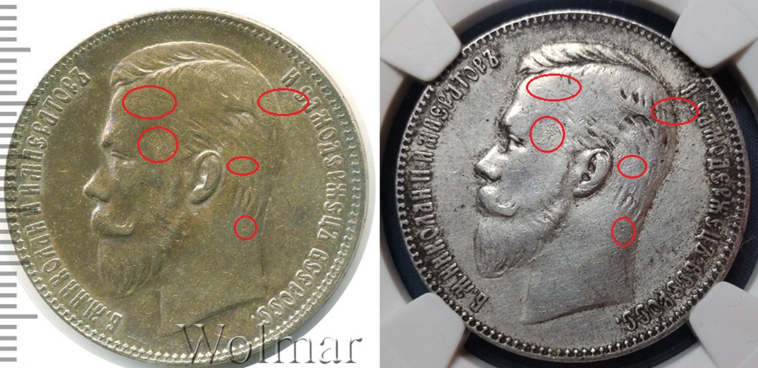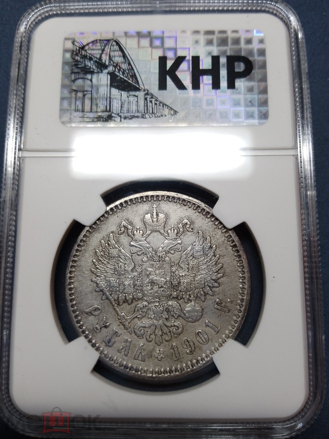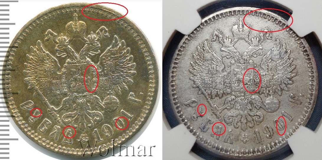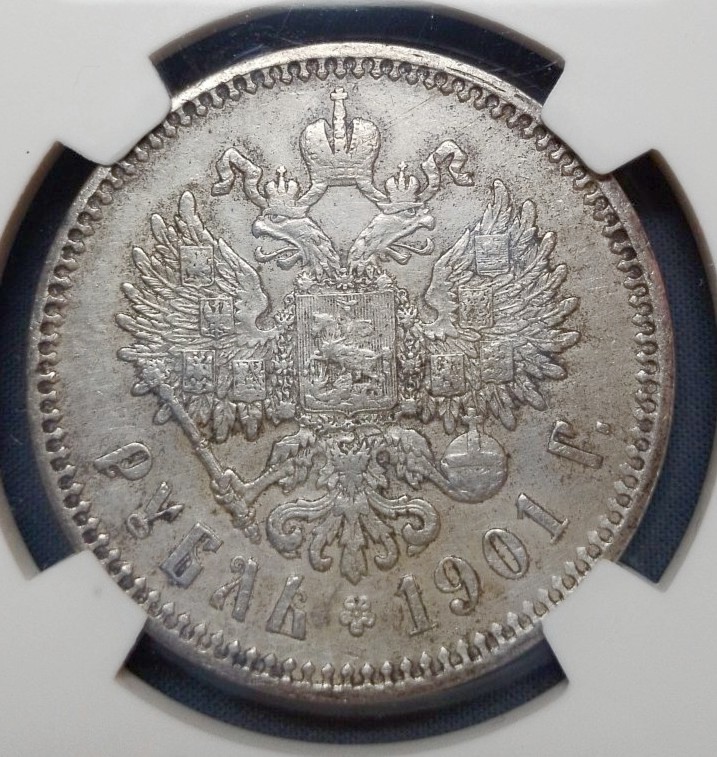 Монета представляет собой подделку серебряного рубля 1901 года, отчеканенного при императоре Николае II. Копия была заключена в пластиковый слаб (капсулу для сертификации) китайской компании КНР с номером АА 1745 и продана на аукционном портале «Мешок». Эксперты единогласно признали её фейком, указав на распространённость подобных подделок в слабах КНР и недобросовестность конкретного продавца.
