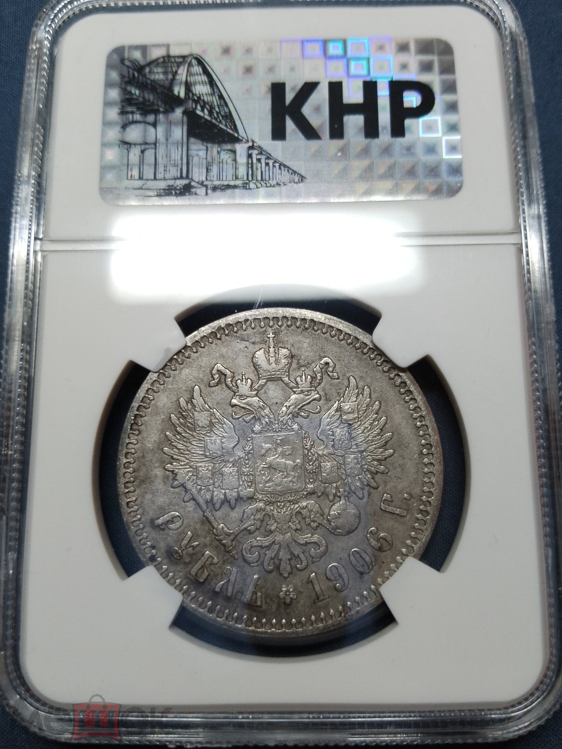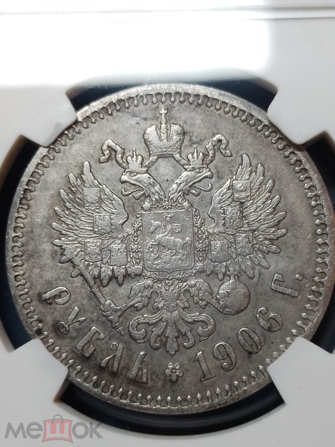 Монета представляет собой копию серебряного рубля 1906 года периода правления Николая II. Подделка была продана на площадке «Мешок» в пластиковом слабе (хранительнице) китайской компании КНР (China Numismatic Society) с номером AA 1743. Эксперты-нумизматы единогласно признали её фейком, указывая на низкое качество и происхождение от известного продавца подделок.