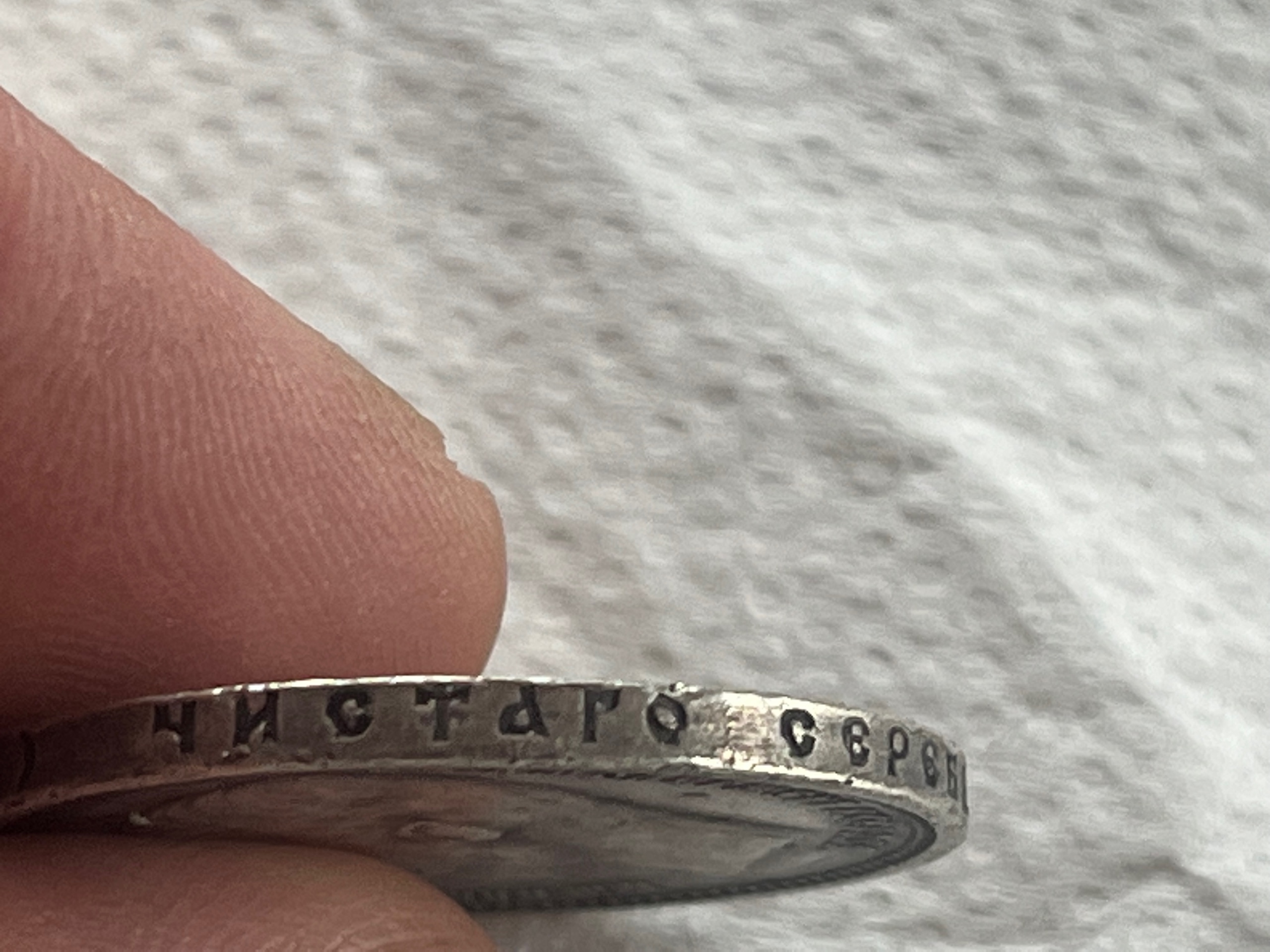 Форма ушей полнота щек не естественная буртовая насечка и на гурте буквы гуляют да и буква (ч) чистого не соответствует оригиналу вес 18 гр не больше это не катькины рубли👆🫰
