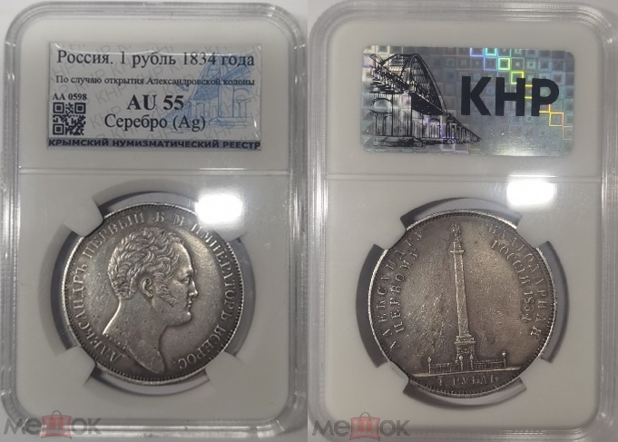 Монета представляет собой серебряный рубль 1834 года (так называемый «Колонна») периода правления Николая I. Это типичная современная подделка, отлитая в Китае и проданная на аукционе «Мешок». Копия была заключена в пластиковый слаб (герметичную капсулу для сертификации) сомнительной китайской грейдинговой компании, что является распространённым признаком фальшивки.