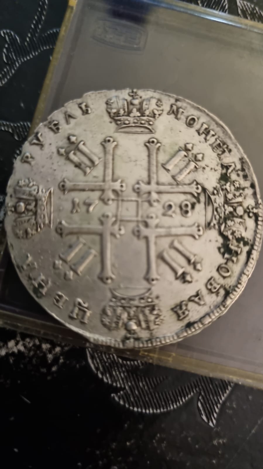 Монета номиналом 1 рубль, отчеканенная в 1728 году от имени императора Петра II. Несмотря на внешнее сходство, большинство экспертов в комментариях сходятся во мнении, что представленный экземпляр является подделкой. Отмечаются низкое качество деталей, отсутствие фото гурта и общий вид, не соответствующий оригинальным монетам того периода.