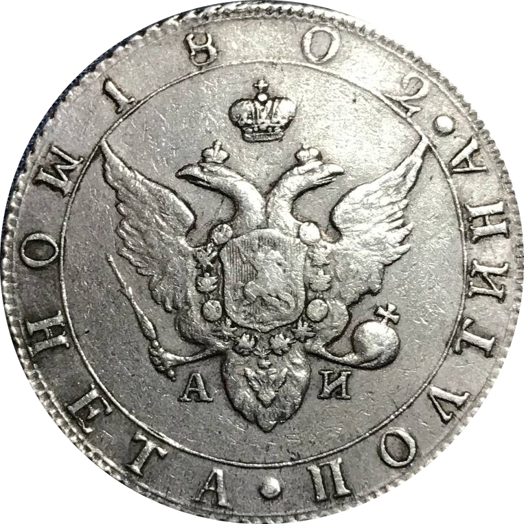 Монета представляет собой копию серебряной полтины 1802 года периода правления Александра I. Подделка была идентифицирована и помещена в слаб (пластиковый холдер) с маркировкой КНР, что указывает на её неподлинное происхождение. Данный экземпляр был выставлен на продажу на аукционном ресурсе, что служит предостережением для коллекционеров.