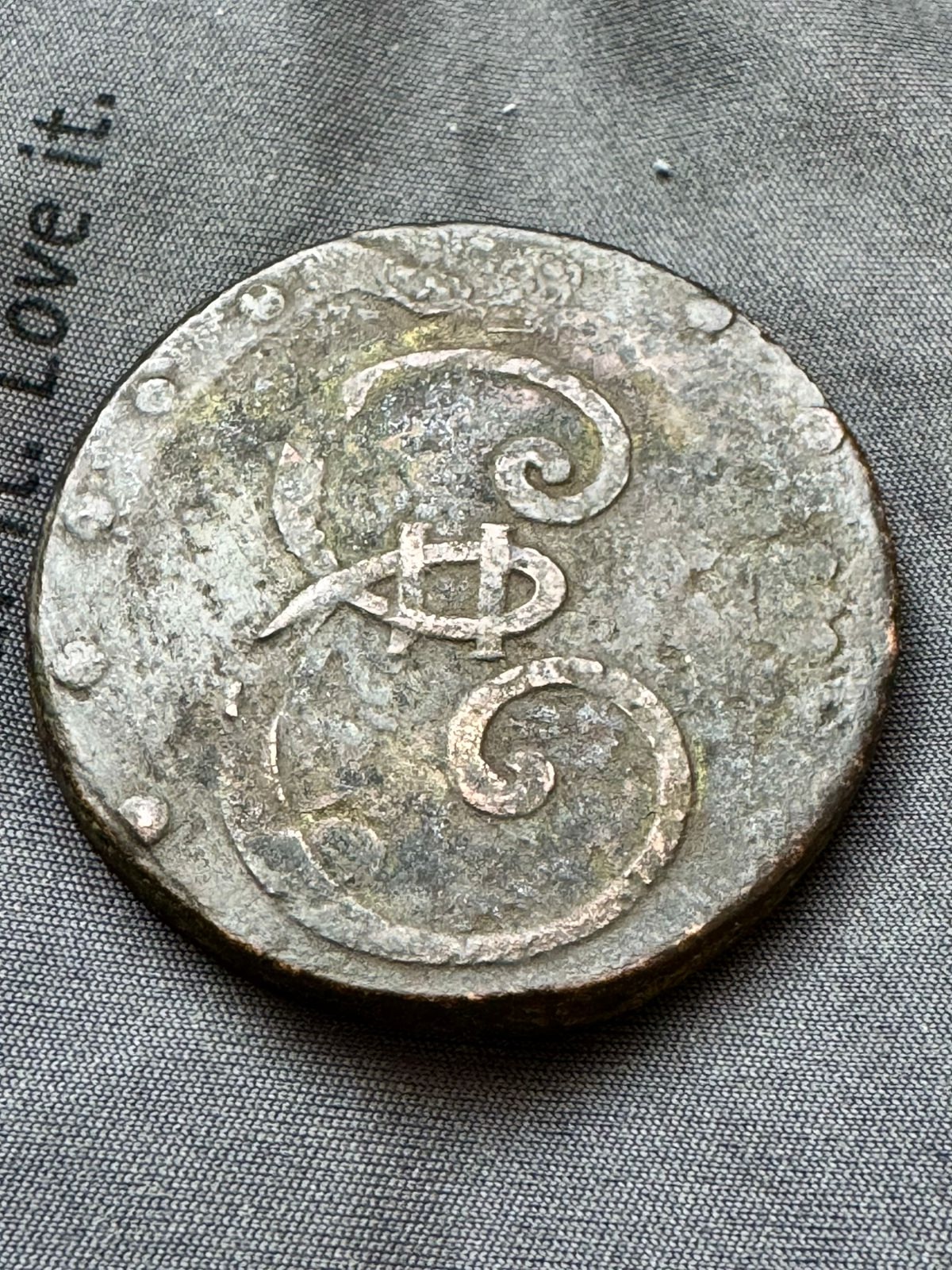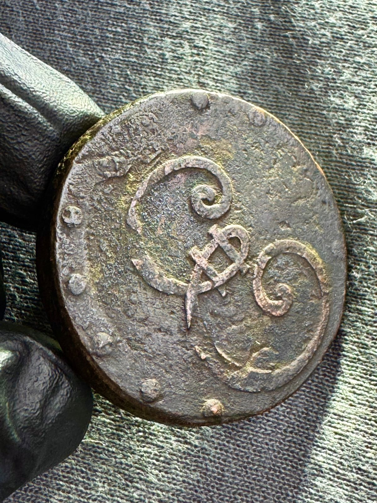 Всем камрадам привет. Я не спец и даже не любитель экспертизы в этом вопросе. Я скорее технолог и практик по изготовлению. Могу сказать одно: штамп был сделан по полностью убитому пятаку. Каверны на поле продолжаются на рисунке. Для такова фуфела надо было либо взять кладовой пятак, либо залощить в грохоте с мельхиоровой дробью какальник а потом еще пройтись латунной щеткой шарошкой. Уже после шлепнуть штамп и состарить электролизом а после нагревая покидать в несколько раз в акамуляторную кислоту. Тогда для продажи на развале блошином сойдет.