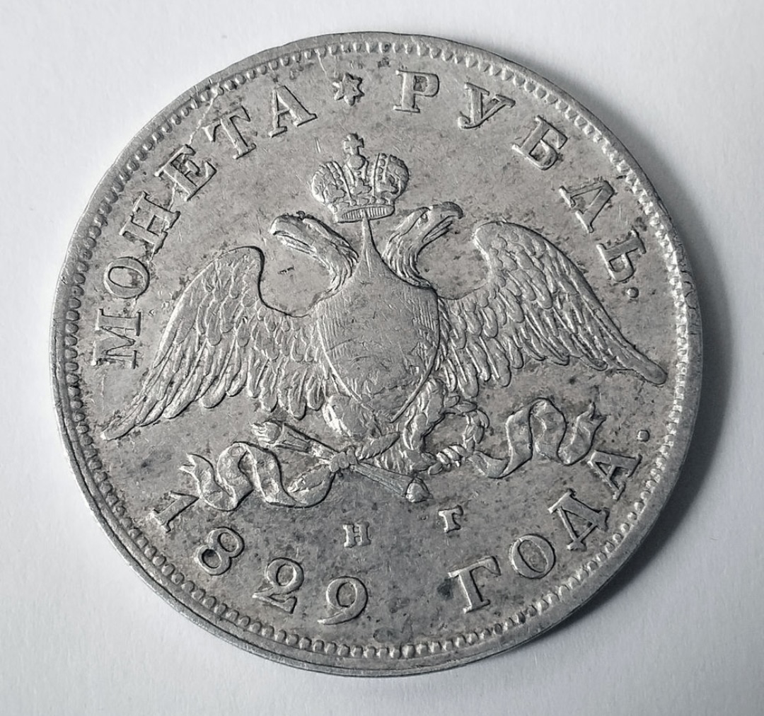 Серебряный рубль 1829 года, отчеканенный в правление императора Николая I. Типовая монета так называемого «масонского» типа с гербом в виде двуглавого орла с распростёртыми крыльями и цепью ордена Святого Андрея Первозванного. Комментарии опытных коллекционеров не выявили признаков подделки, монета признана подлинной и рядовой.