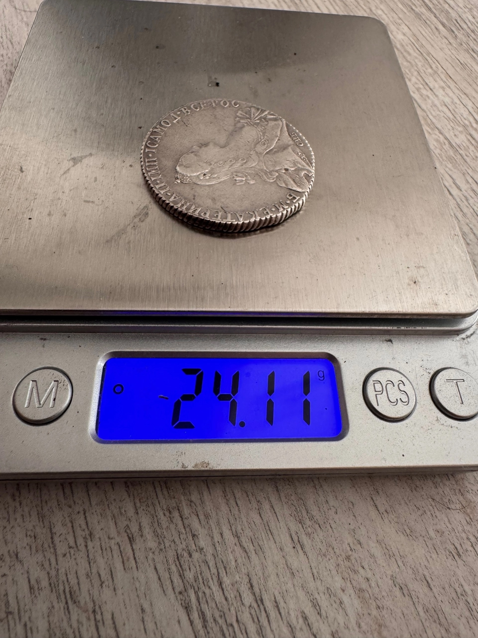 Серебряный рубль 1772 года, отчеканенный в период правления императрицы Екатерины II. Монета имеет признаки подлинности, однако вызывает дискуссии среди экспертов из-за незначительного отклонения в весе и особенностей гурта. Большинство комментаторов в обсуждении сошлись во мнении, что это оригинальный экземпляр, возможно, побывавший в пожаре.