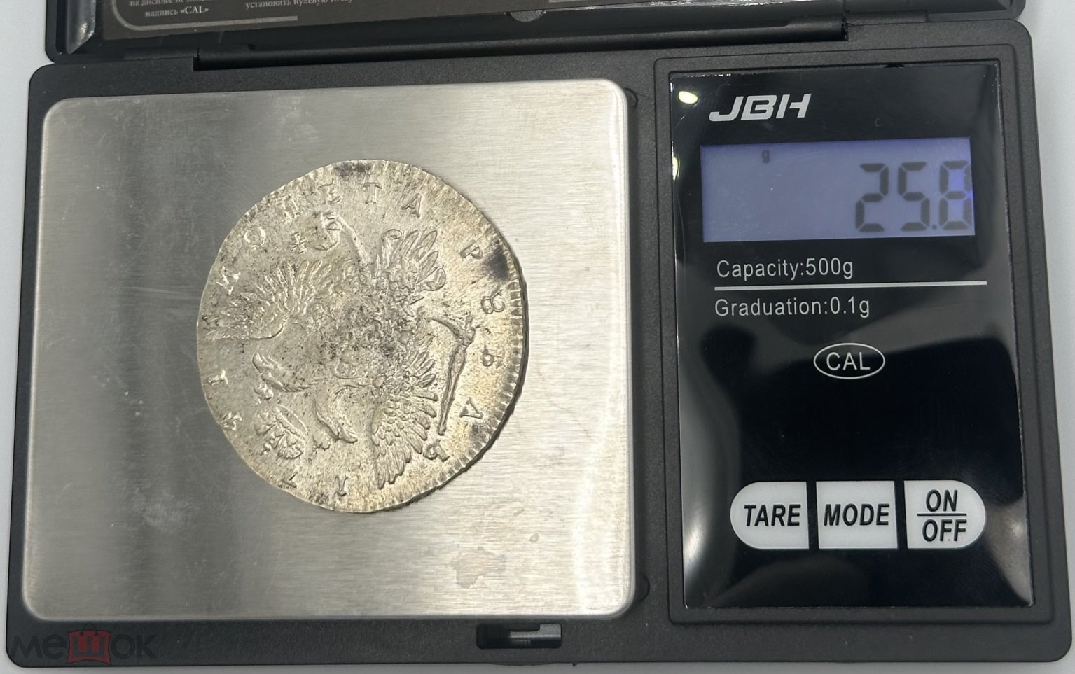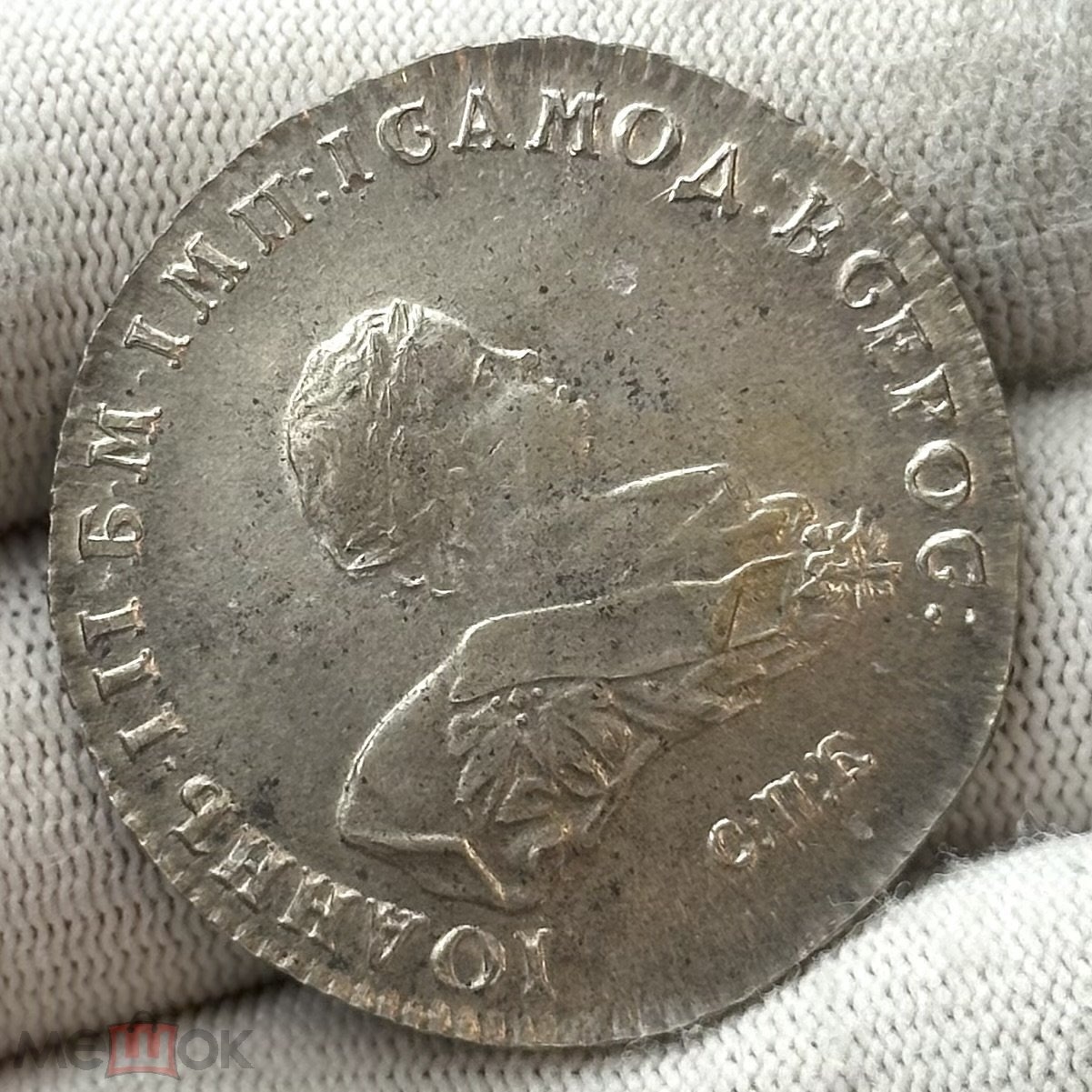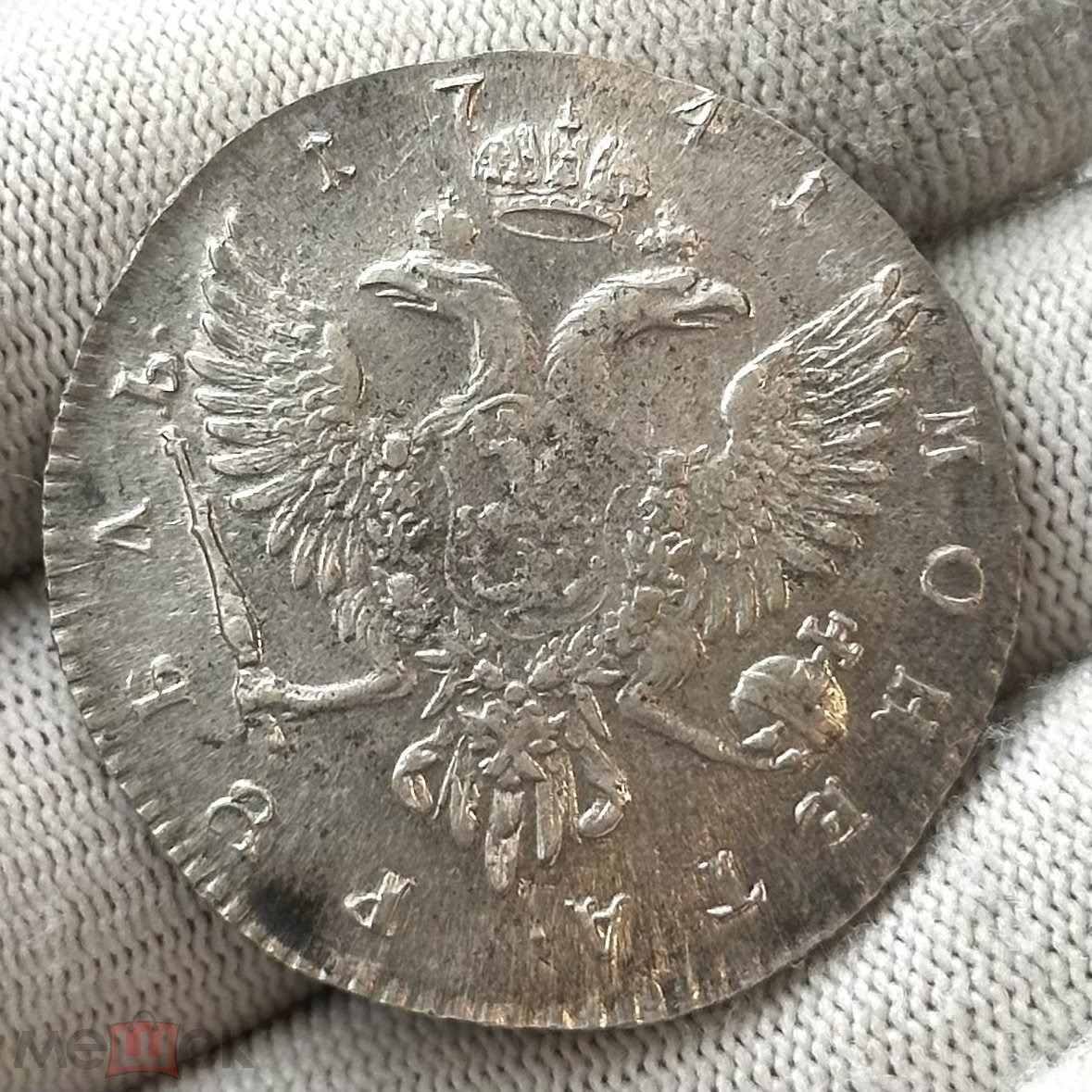 Монета представляет собой реплику серебряного рубля 1741 года, отчеканенного в правление императрицы Елизаветы Петровны. Несмотря на высокое качество исполнения, это современная подделка, изначально продававшаяся как реплика. Отсутствие характерных для подлинных экземпляров признаков, таких как естественные слои патины и структура металла, выдаёт её искусственное происхождение.