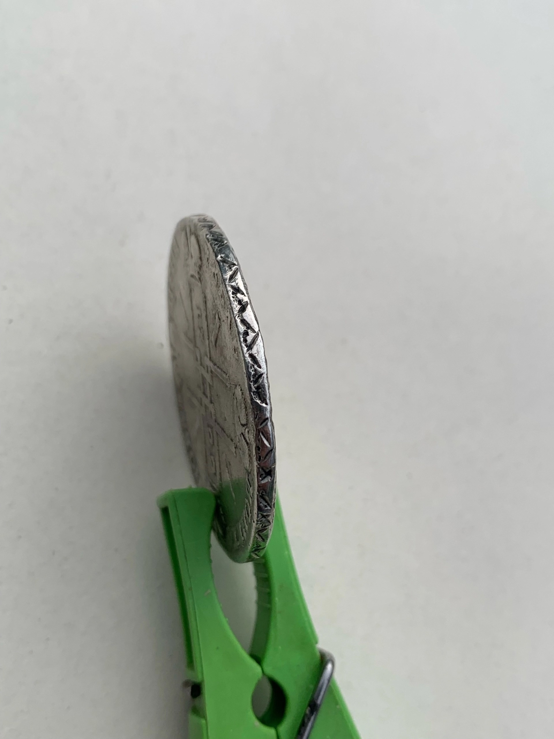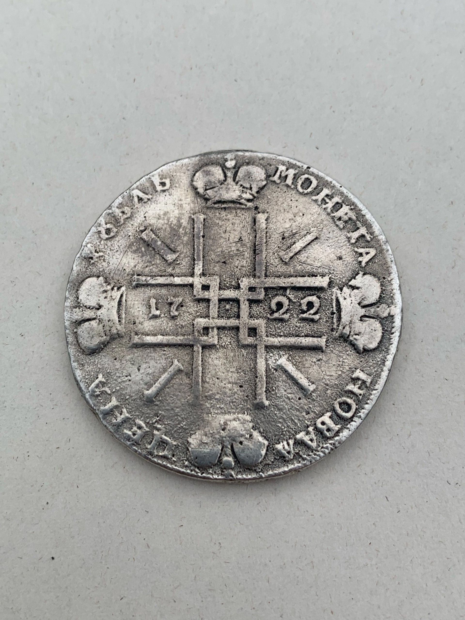 Представленная монета — рубль 1722 года, отчеканенный в период правления Петра I. Это грубая современная копия, выполненная методом литья. Подлинный рубль этого года имеет чёткую гуртовую надпись, а не гладкий или примитивный гурт, как у данной подделки.