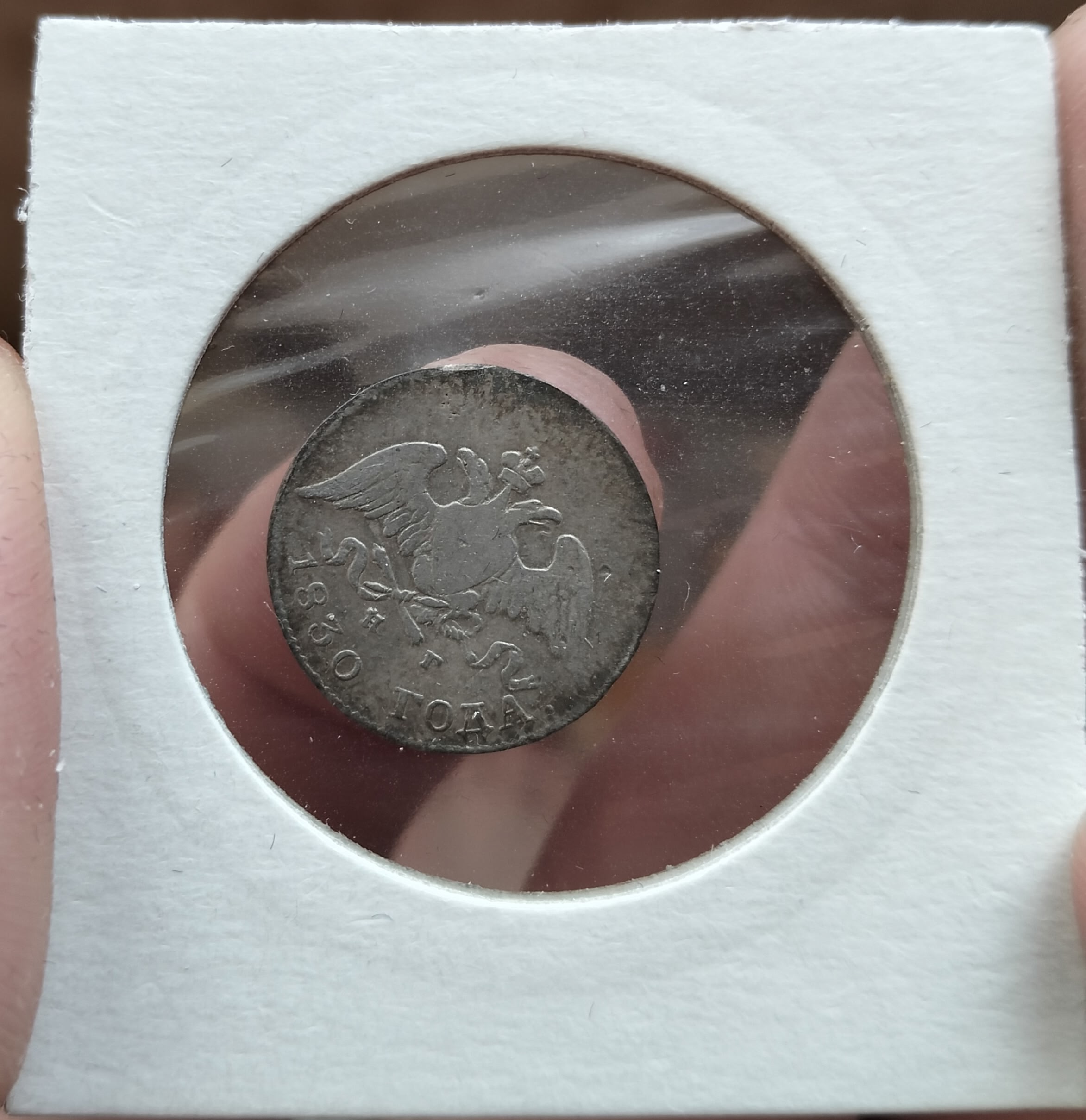 Серебряные 10 копеек 1830 года, отчеканенные в период правления императора Николая I. Монета имеет стандартные параметры для данного номинала и года: вес около 2 грамм, серебро 868-й пробы. Судя по консенсусу в комментариях, представленный экземпляр является подлинным, хотя для полной уверенности рекомендуется проверка гурта и точного веса.