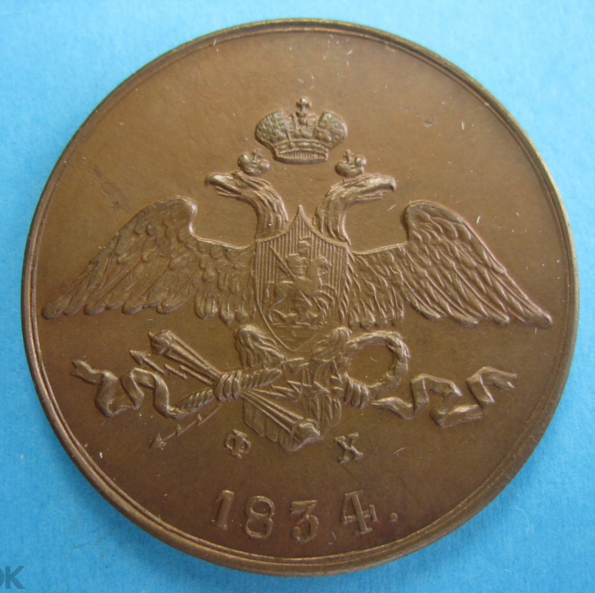 Медная монета номиналом 5 копеек, отчеканенная в 1834 году на Екатеринбургском монетном дворе (инициалы минцмейстера Фёдора Хвощинского — ФХ) в период правления Николая I. Данный экземпляр является копией, о чём прямо указано в посте. Комментарии подтверждают поддельность, указывая на характерные для литья дефекты: слишком ровное поле и кривые буквы в обозначении года и инициалах минцмейстера.