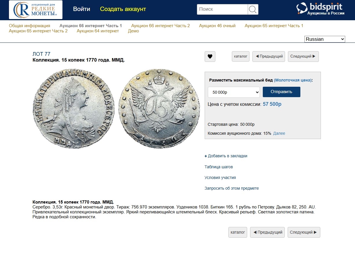 Монета 15 копеек 1770 года, отчеканенная на Московском монетном дворе (ММД) в период правления Емператрицы Екатерины II. Представленный экземпляр является современной подделкой (копией), о чём прямо указано в посте. Комментаторы иронично отмечают, что продавцы таких фальшивок предлагают на них «пожизненную гарантию», что является маркетинговым ходом для введения в заблуждение неопытных коллекционеров.