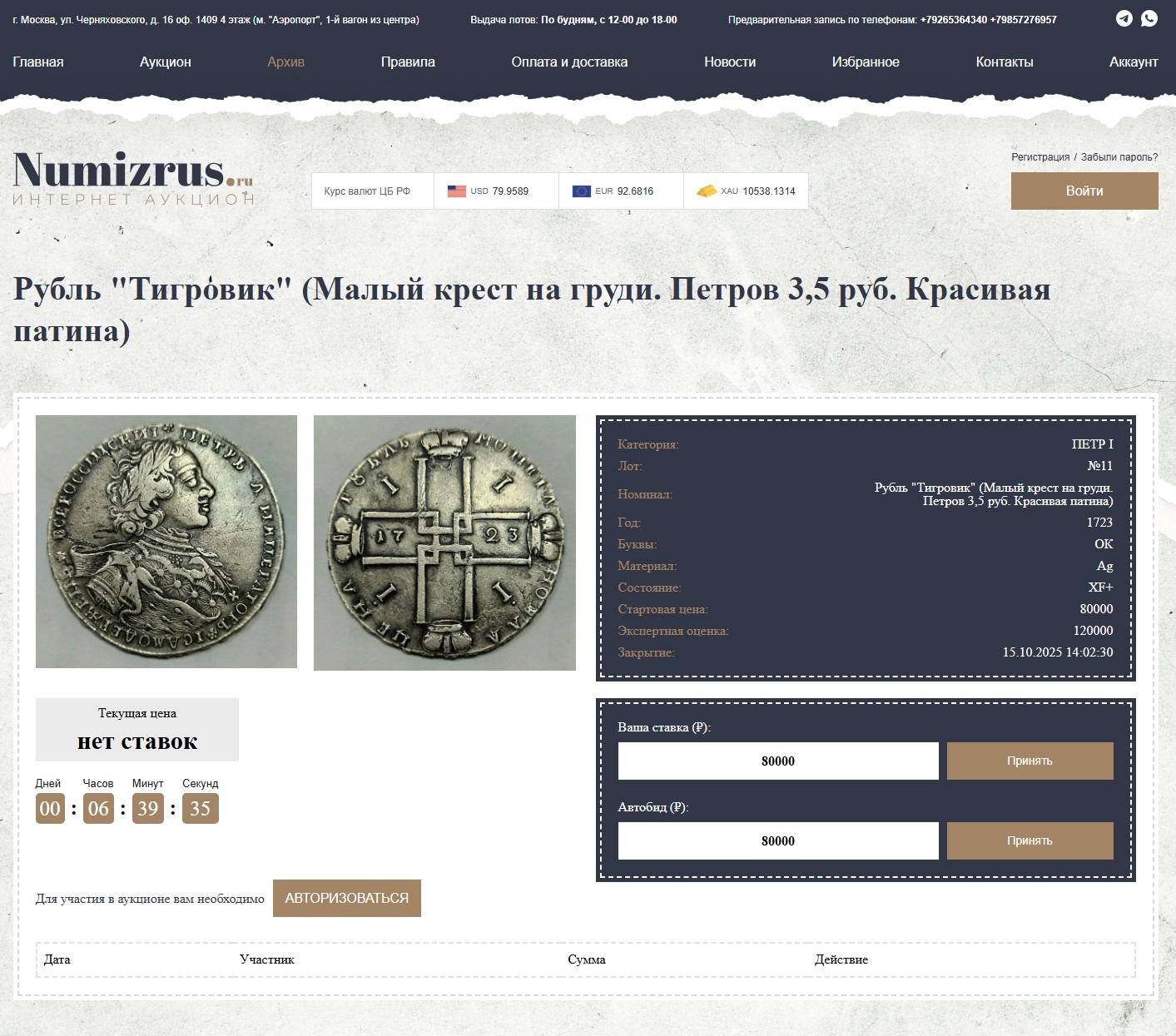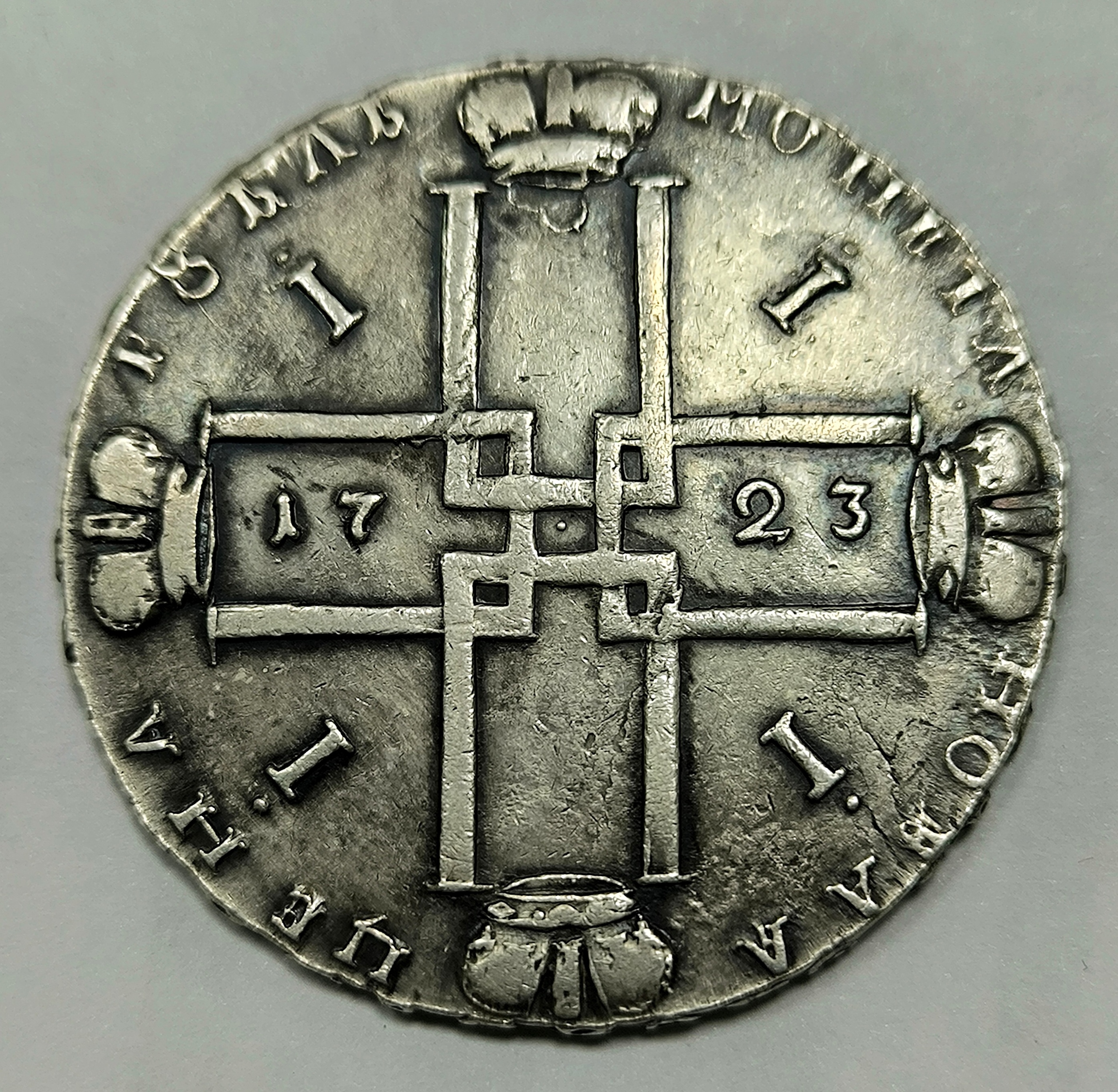Монета представляет собой копию серебряного рубля 1723 года, отчеканенного в период правления Петра I. В нумизматическом сообществе она единогласно признана подделкой, о чём свидетельствуют комментарии экспертов. Её часто называют «китайской залипухой» или «клоном», что указывает на низкое качество и неоригинальное происхождение.