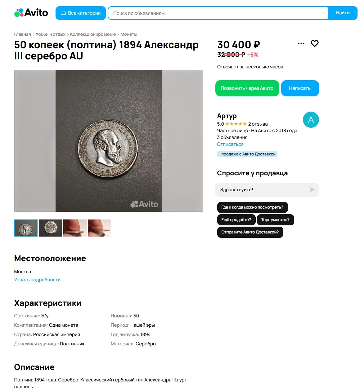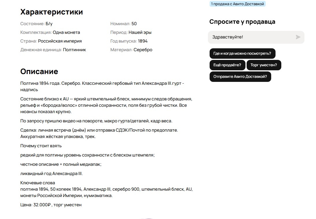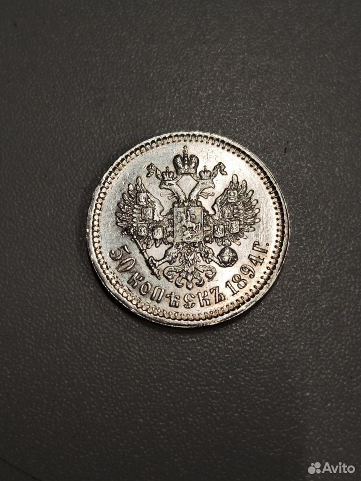 Монета номиналом 50 копеек 1894 года, отчеканенная в период правления императора Александра III. Судя по консенсусу в комментариях, это подделка. Эксперты отмечают некачественный буртик и гурт, что характерно для литых или гальванических копий, а не для оригинальных серебряных монет того периода.