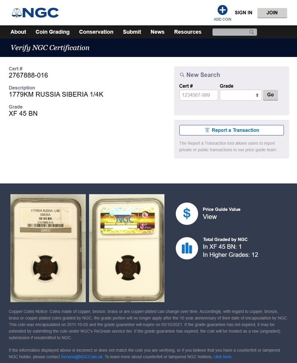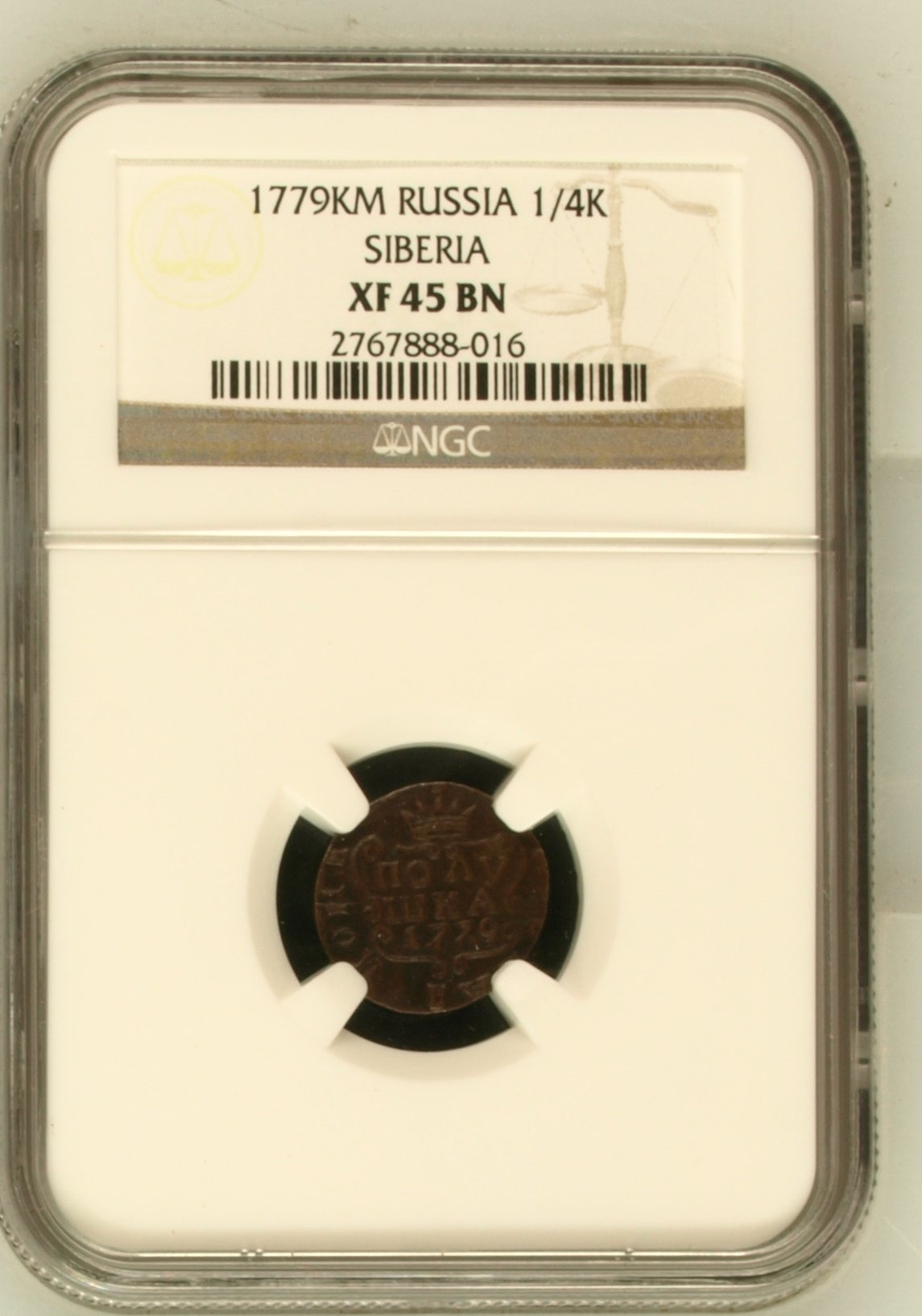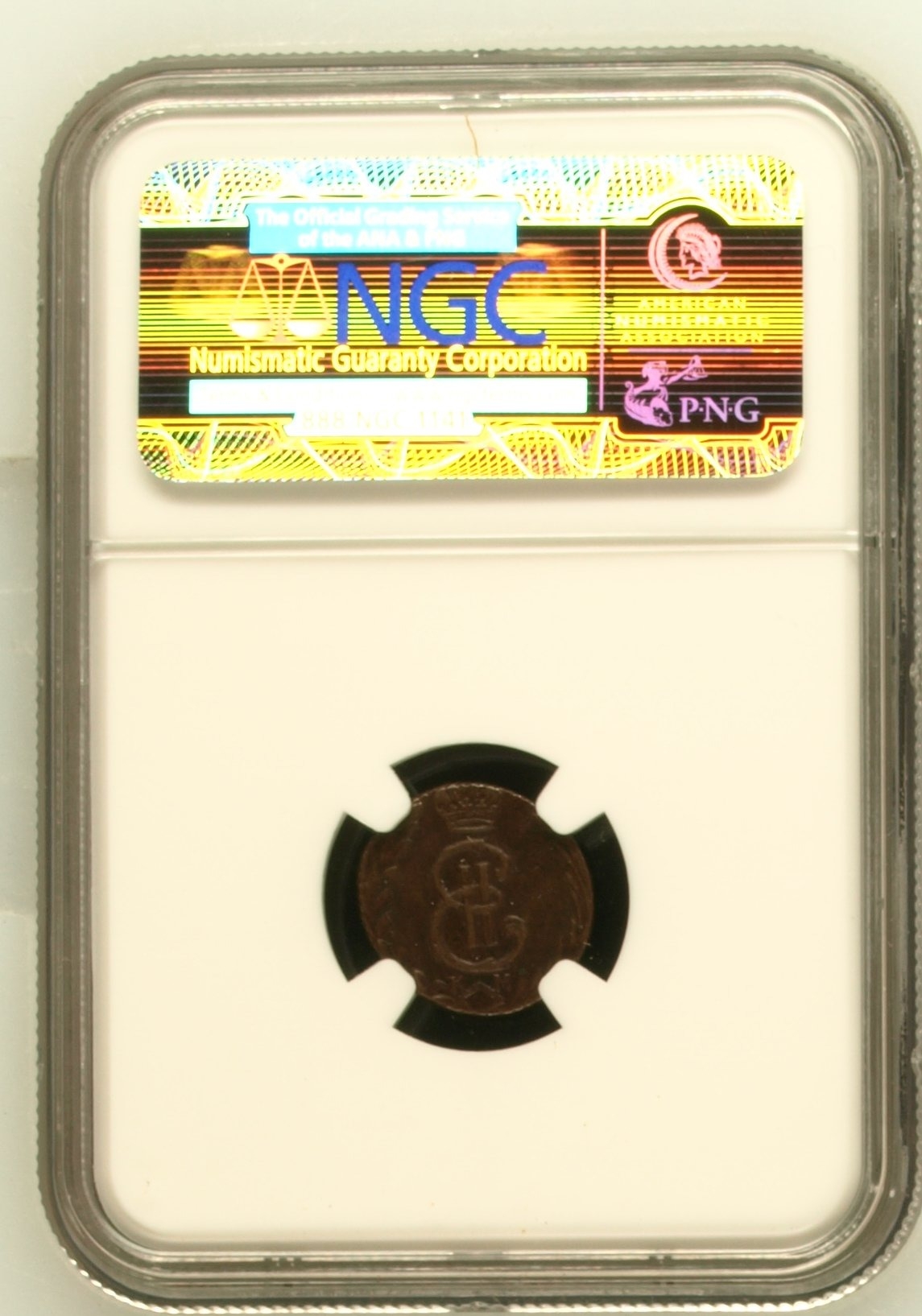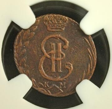 Медная полушка 1779 года, отчеканенная в правление Екатерины II. Монета представлена в сертифицированном слабе (пластиковой капсуле) компании NGC, что должно гарантировать её подлинность. Однако, согласно консенсусу экспертов в комментариях, это современная качественная подделка, помещённая в подлинный старый слаб.