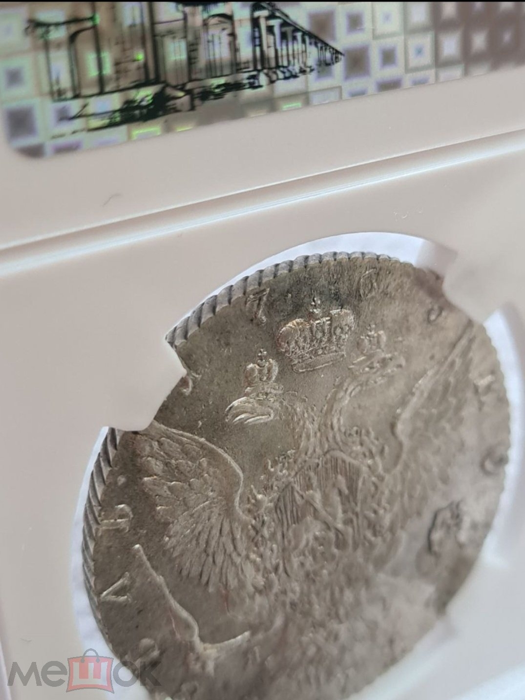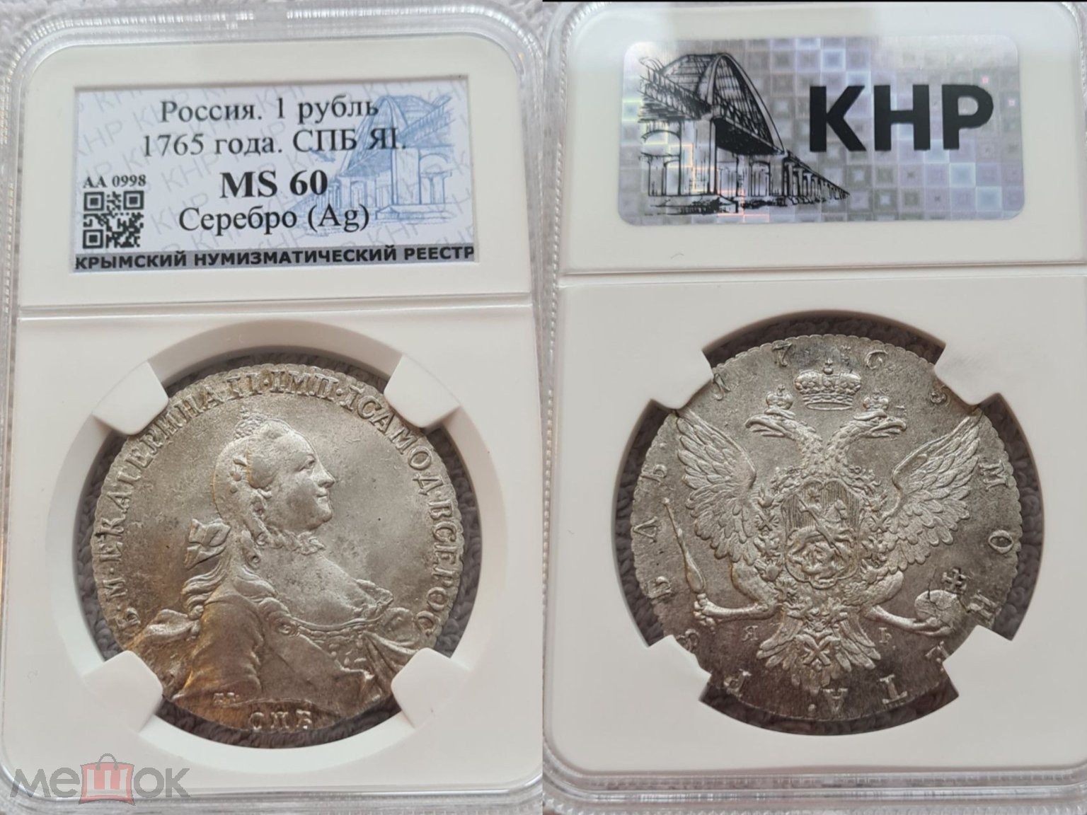 Монета представляет собой копию серебряного рубля 1765 года периода правления Екатерины II, отчеканенного на Санкт-Петербургском монетном дворе (обозначение СПБ). В оригинале это редкая и ценная монета. Представленный экземпляр является современной подделкой, о чём прямо указано в посте и подтверждено комментаторами, отмечающими низкое качество и происхождение.