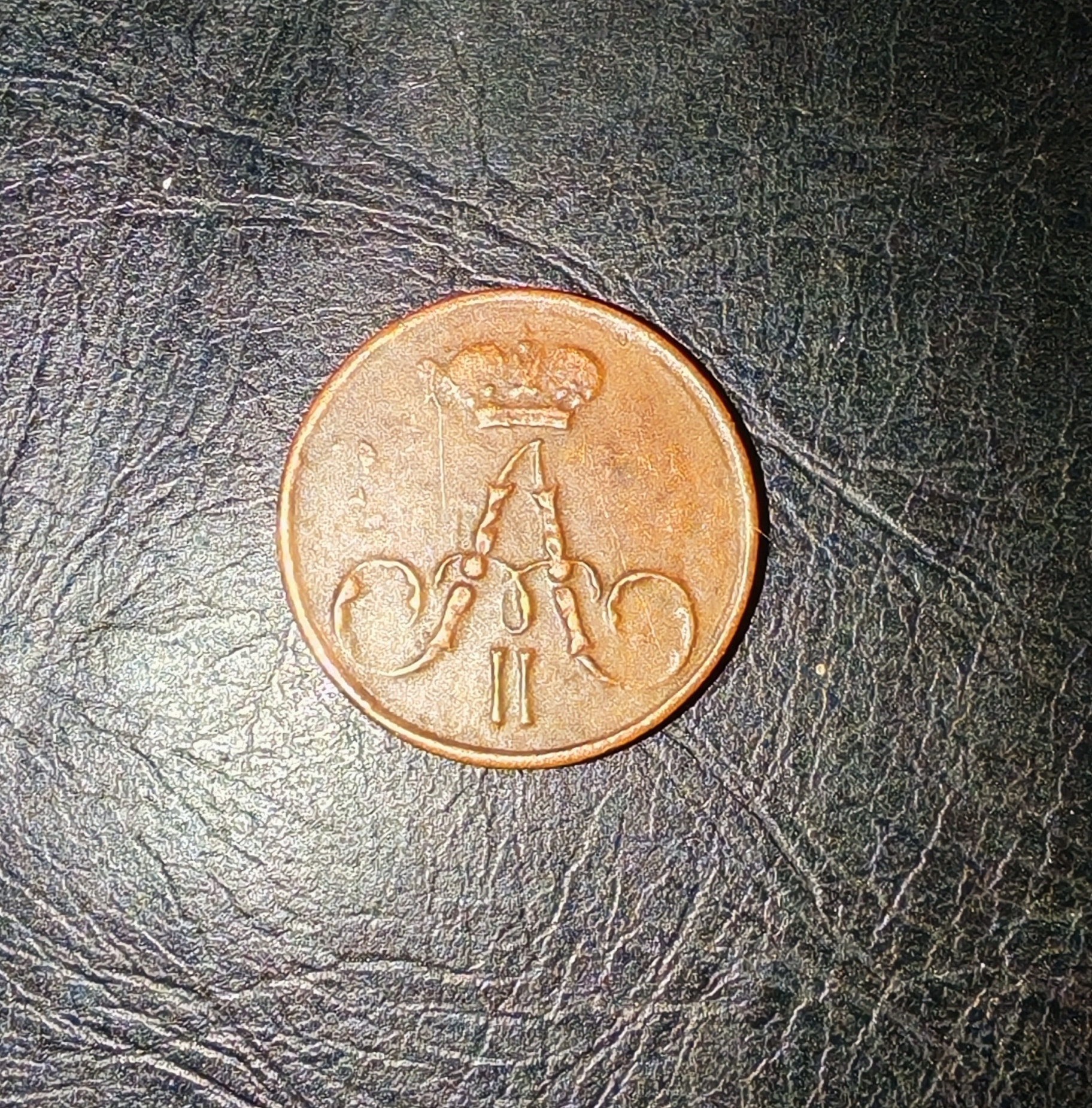 Монета представляет собой медную полушку 1858 года, отчеканенную на Екатеринбургском монетном дворе (знак «ЕМ»). Несмотря на внешнее сходство, монета является современной подделкой. Об этом свидетельствуют её кривизна и низкое качество изготовления, характерные для фальшивок.