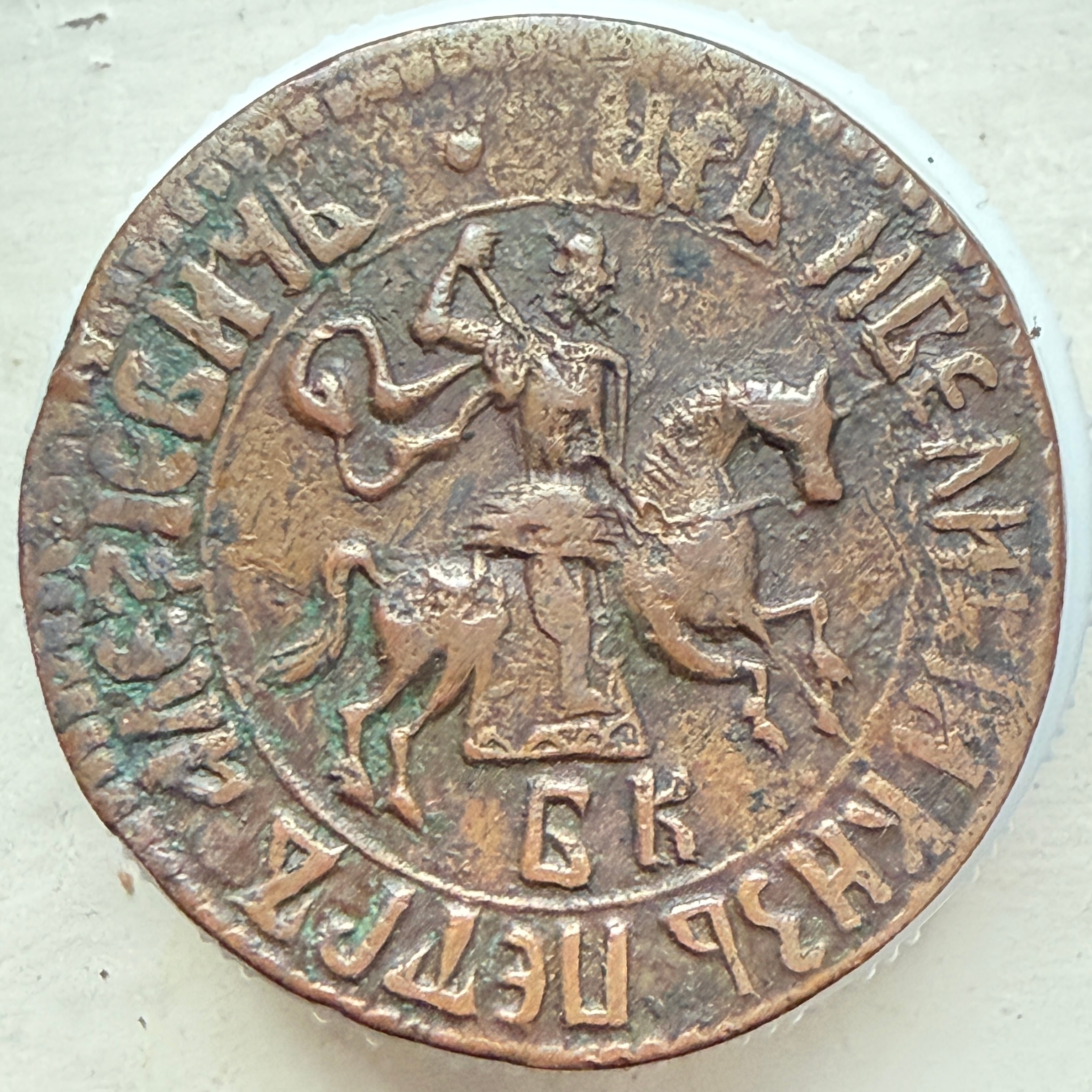 Монета представлена как медная копейка 1705 года, отчеканенная в правление Петра I. Однако, судя по консенсусу в комментариях, это современная подделка. Эксперты отмечают искусственное состаривание, нехарактерную «зелень», которая выглядит как краска и местами отслаивается, что не соответствует естественным процессам окисления и патинирования меди.