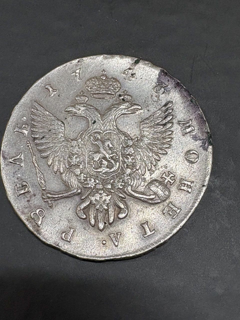 Серебряный рубль 1743 года, отчеканенный в правление императрицы Елизаветы Петровны. Монета имеет характерные для подлинных экземпляров того периода особенности чеканки и патину. Большинство экспертов в обсуждении признали её оригинальной, несмотря на вопросы о рельефе поверхности.
