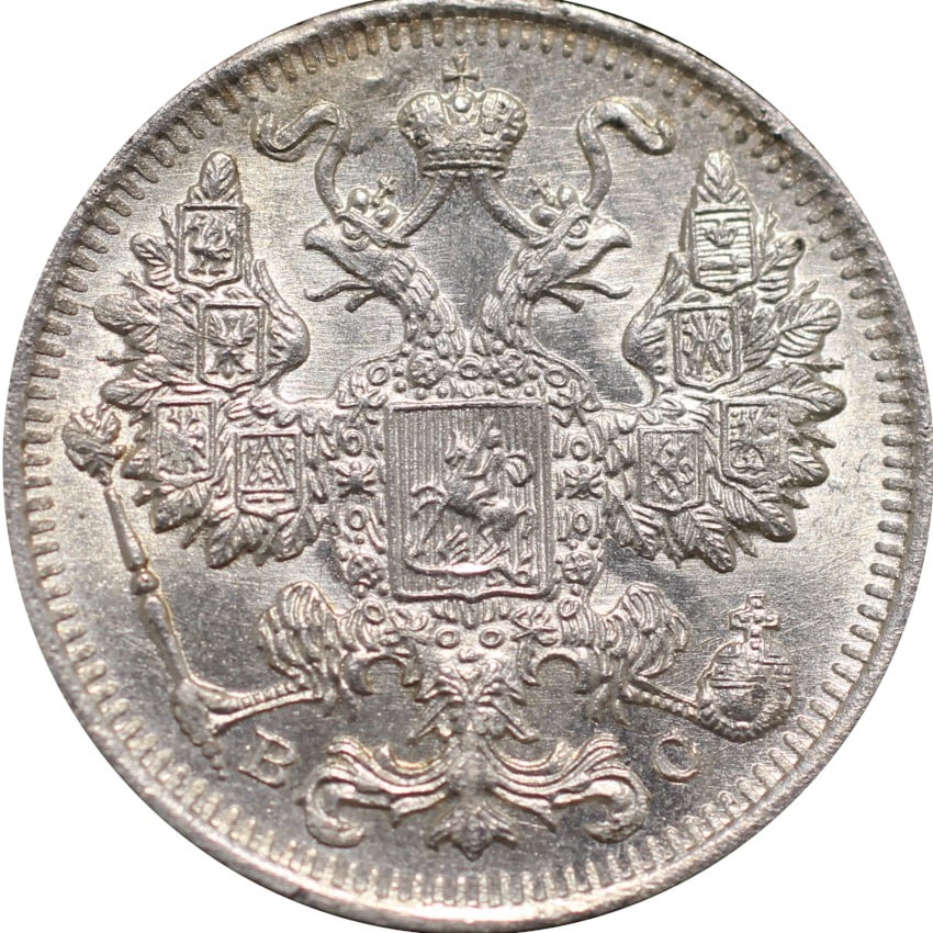Монета номиналом 15 копеек 1917 года, отчеканенная в серебре при Николае II. Представленный экземпляр является подделкой. На это указывают грубые искажения в прочекане даты, нечитаемые детали реверса и признаки постороннего вмешательства, такие как возможная напайка цифр.