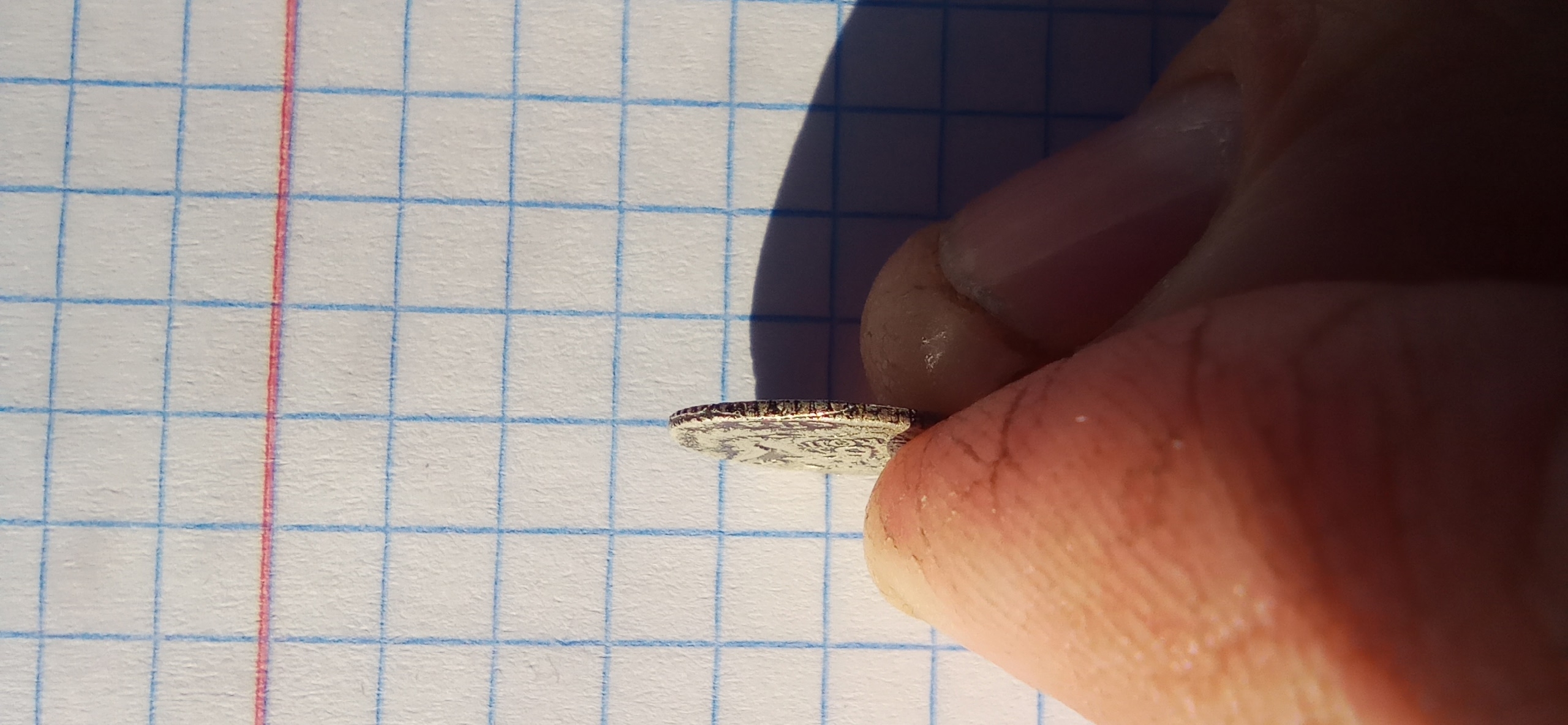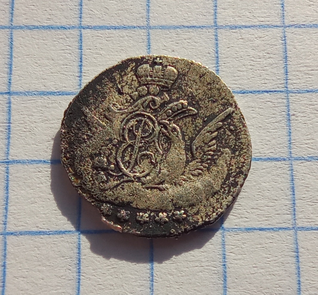 Серебряная монета 5 копеек 1758 года, отчеканенная при императрице Елизавете Петровне на Санкт-Петербургском монетном дворе (СПБ). Монета имеет сильный износ, окислы и, вероятно, была в огне, что объясняет критическую потерю веса. Несмотря на аномально низкий вес, большинство экспертов склоняется к её подлинности, считая повреждение бытовым, а не признаком подделки.