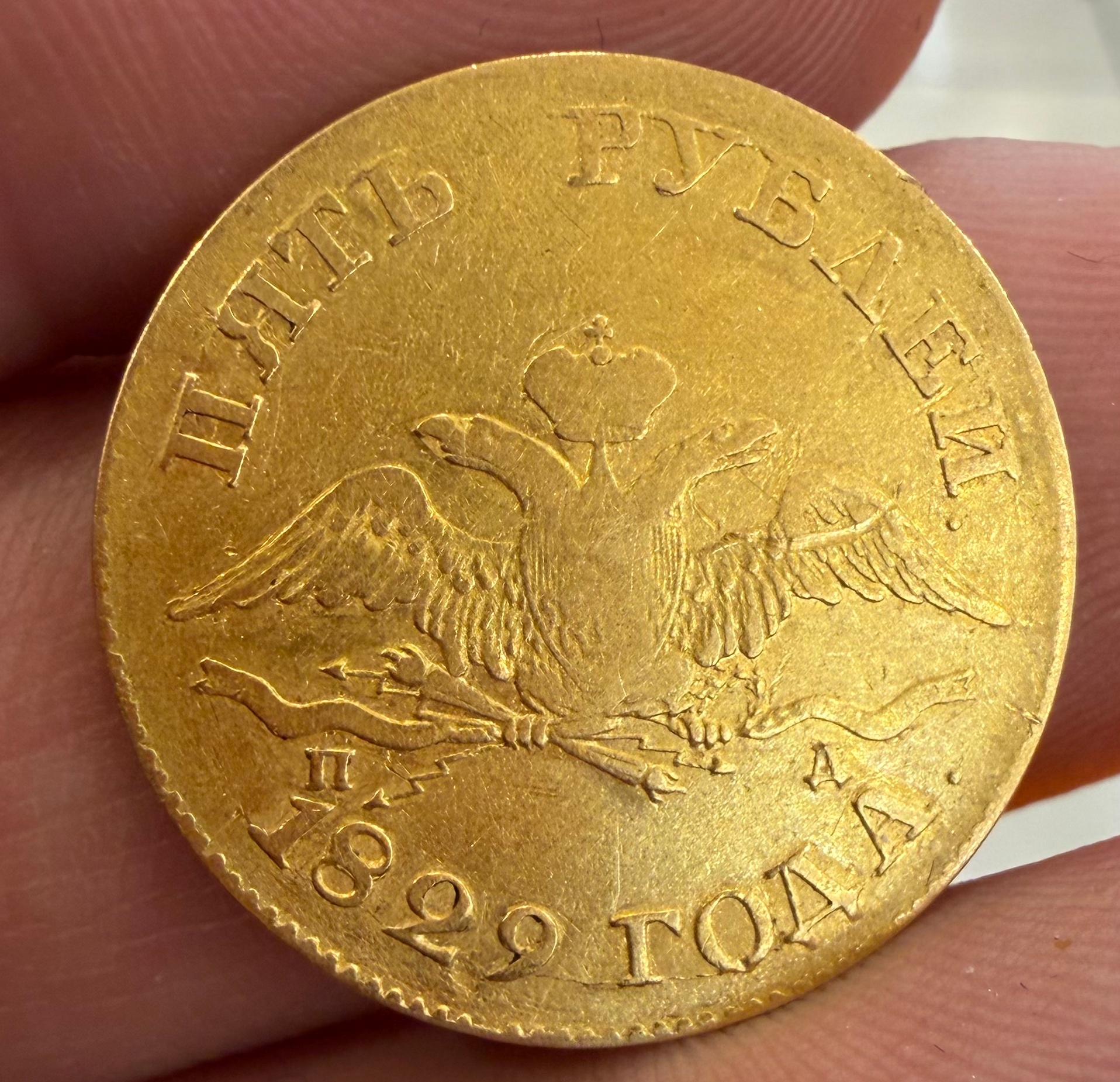 Золотая монета 5 рублей 1829 года, отчеканенная в период правления императора Николая I. Монета вызывает сомнения в подлинности из-за несоответствия гурта оригинальным стандартам, скачущих букв на аверсе и проблем с кантом. Большинство экспертов в обсуждении склоняются к версии, что это фейк или неудачная реставрация.