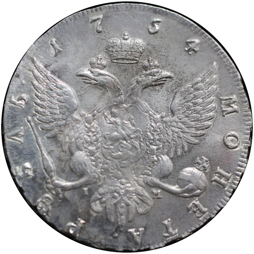 Монета представляет собой подделку серебряного рубля 1754 года периода правления императрицы Елизаветы Петровны. Оригинальные рубли этого года чеканились на Санкт-Петербургском монетном дворе и имеют высокую коллекционную ценность. Представленный экземпляр является современной копией низкого качества, о чём прямо указано в посте и подтверждено консенсусом в комментариях.
