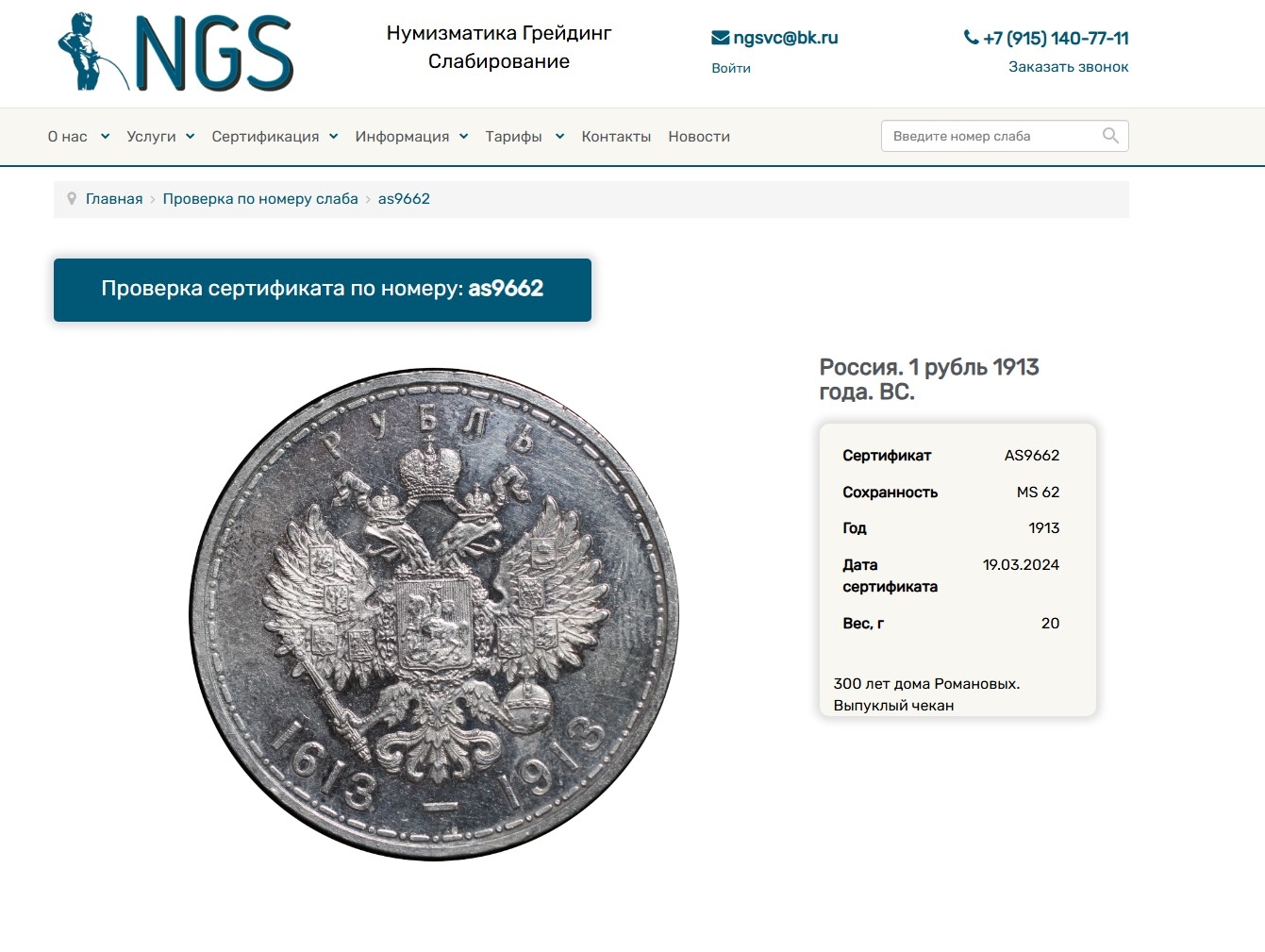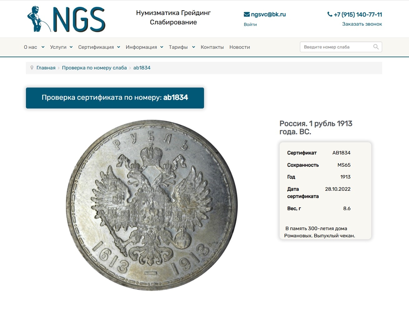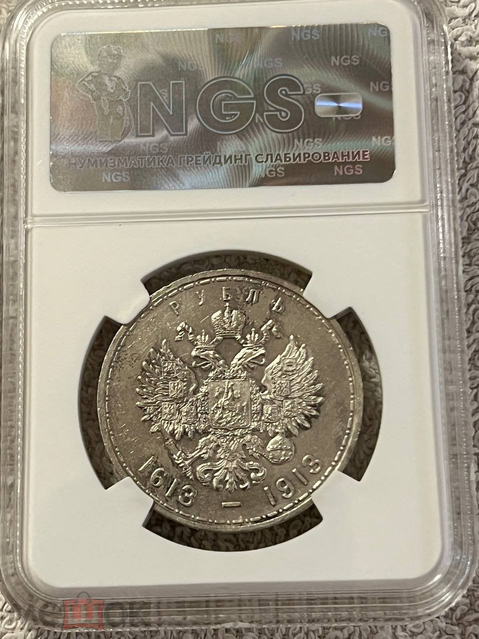 Юбилейный рубль 1913 года, выпущенный в честь 300-летия правления Дома Романовых. Монета является подделкой, помещённой в фальшивый пластиковый слаб (капсулу для сертификации) с искусственно завышенным грейдом (оценкой состояния). Эксперты отмечают несоответствие состояния монеты указанной высокой оценке.